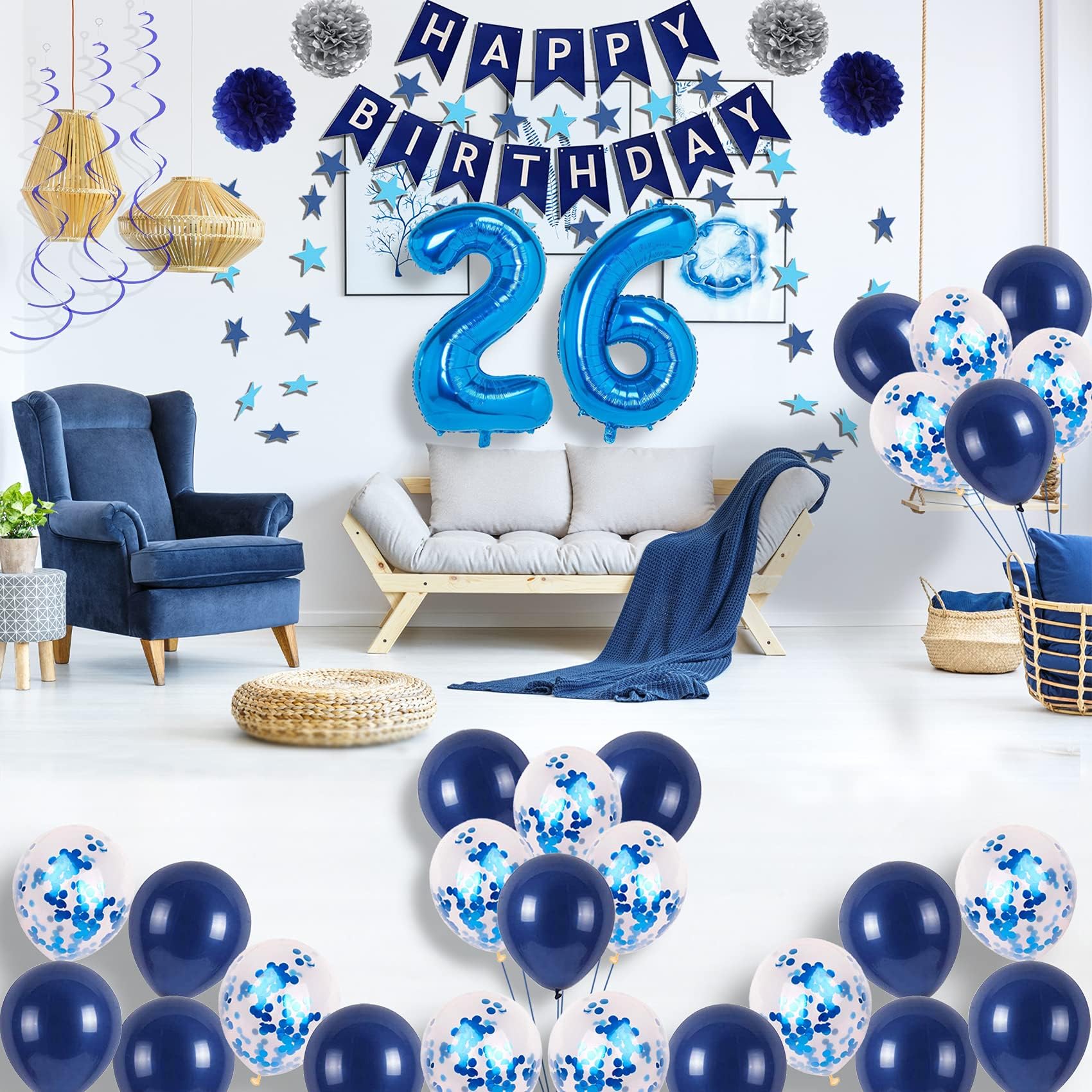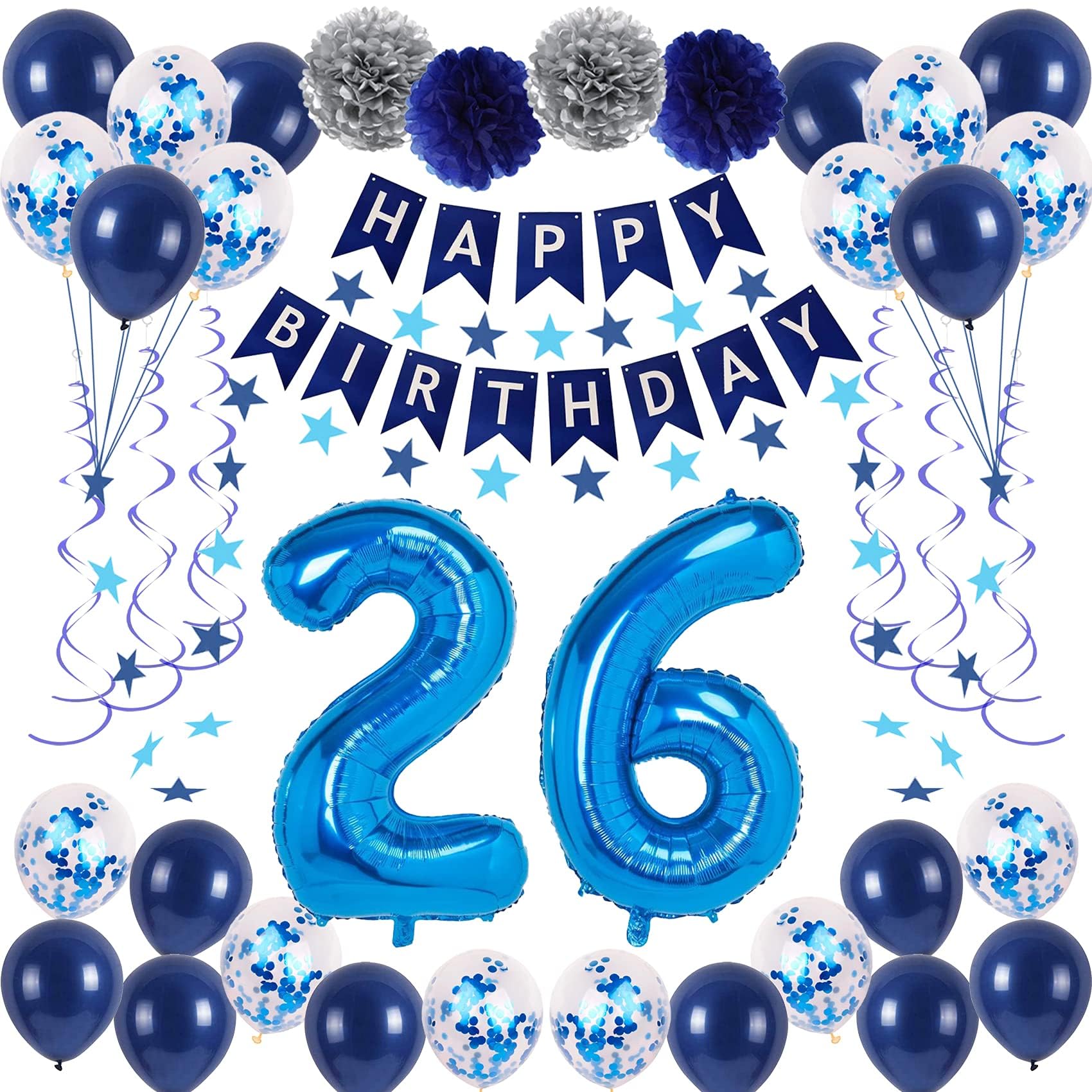 About The Blue Theme 26 Birthday Party Decorations Set Do You Wanna Embellish Your Birthday? Come On Lets Sing And Dance. We Sincerely Hope To Bring Wonderful Memories For Your 26 Years Old Birthday With Our Crafted Blue Theme Party Suit Package Includes: ? ''Happy Birthday'' Banner*1 Set ? 13 Feet Star Streamers Garland*1 Set(33 Stars) ? 28 Inches Hanging Swirls*1 Set(6 Streamers) ? 32 Inches Blue Number Foil Balloon*2 ? 6 Inches Silver Paper Flower*2 ? 6 Inches Blue Paper Flower*2 ? 12 Inches Navy Blue Latex Balloon*14 ? 12 Inches Blue Confetti Balloon*12 Warm Note: 1. Do Not Inflate These Balloons Too Full, 80% Is Fine 2. Latex Balloons Could Keep Inflated 2 Days When Filled With Air And 3-6 Hours With Helium 3. Please Inflate These Balloons 1-2 Days Before Your Party, Avoiding Excessive Sun Exposure.