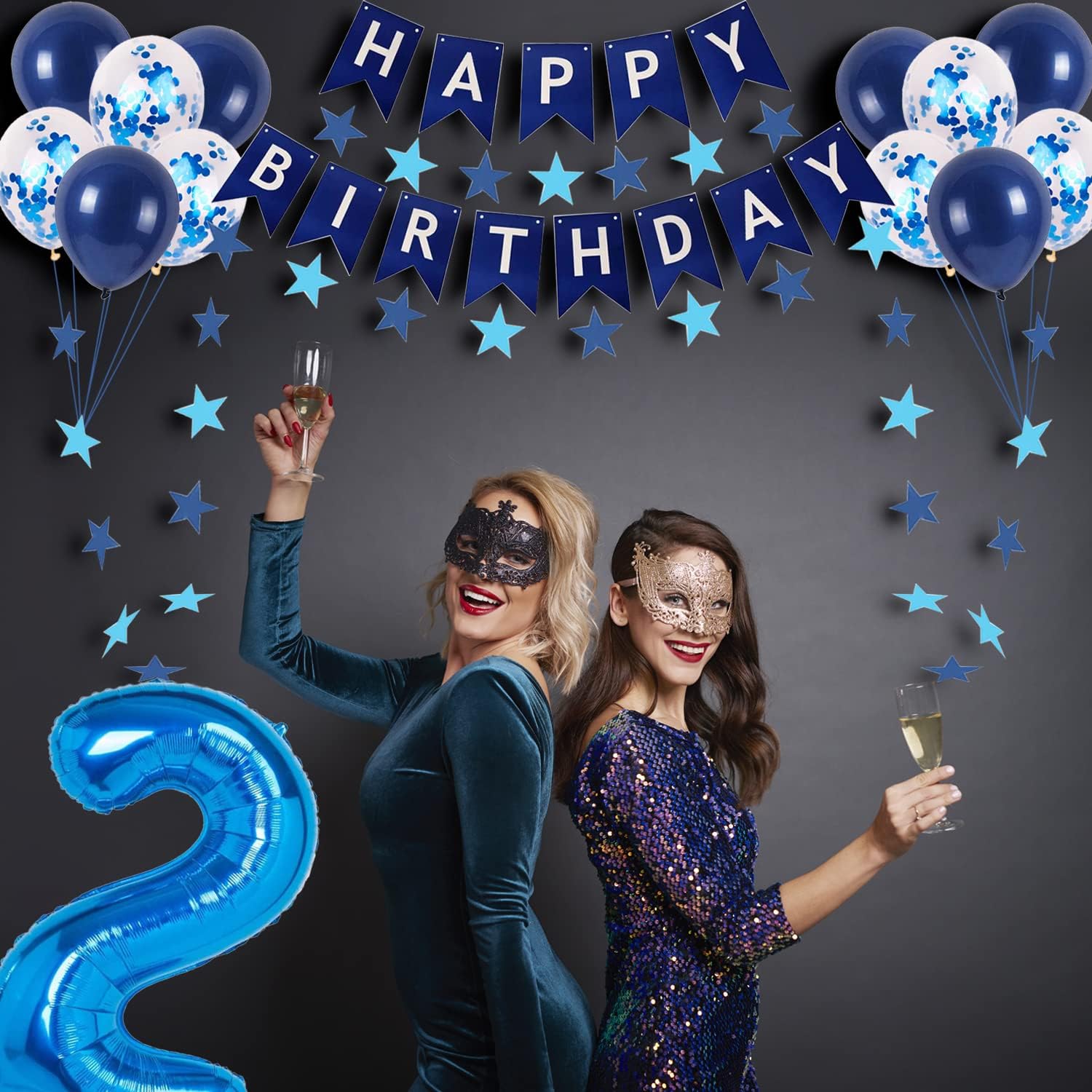 - Q: What is included in the NANINUNENO 27th Blue Birthday Party Decorations set? A: The set includes a 'HAPPY BIRTHDAY' banner, 2 royal blue number 27 foil balloons, a star streamers garland with 33 stars, blue hanging swirls, 2 silver paper flowers, 2 blue paper flowers, 14 navy blue latex balloons, and 12 confetti balloons.
