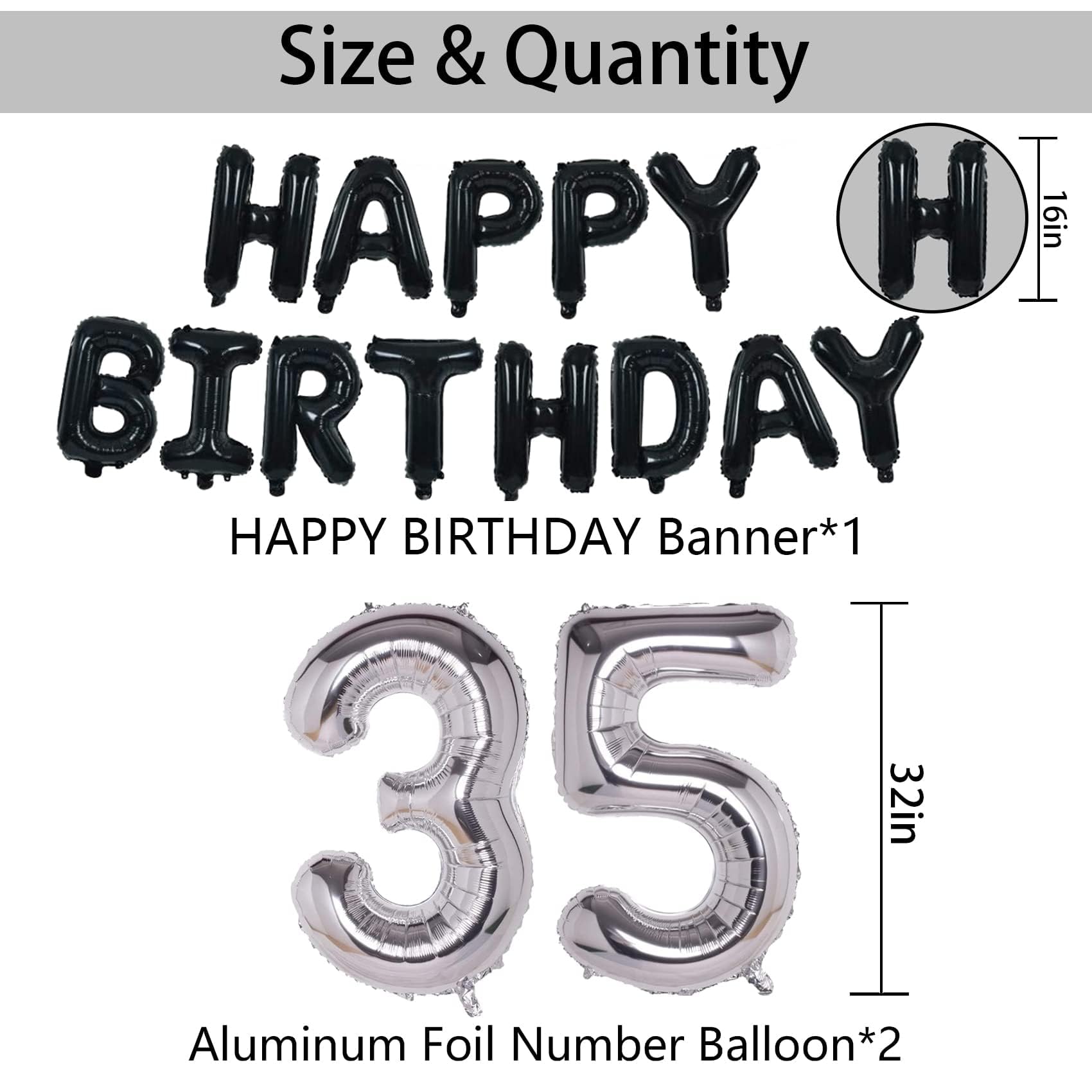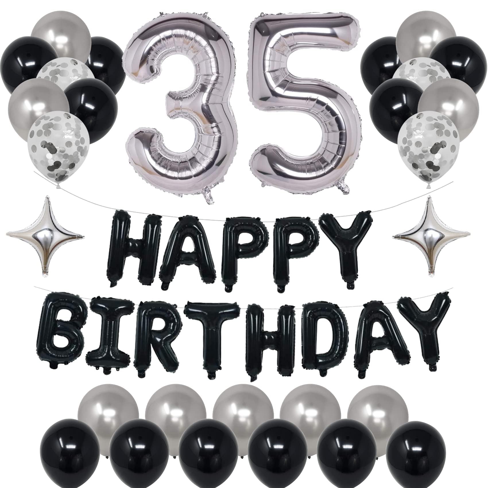 - Q: What items are included in the NANINUNENO 35th Birthday Party Decorations kit? A: The NANINUNENO kit includes a 'HAPPY BIRTHDAY' banner, two number 35 foil balloons, two star foil balloons, twelve black latex balloons, ten silver latex balloons, and four silver confetti balloons.