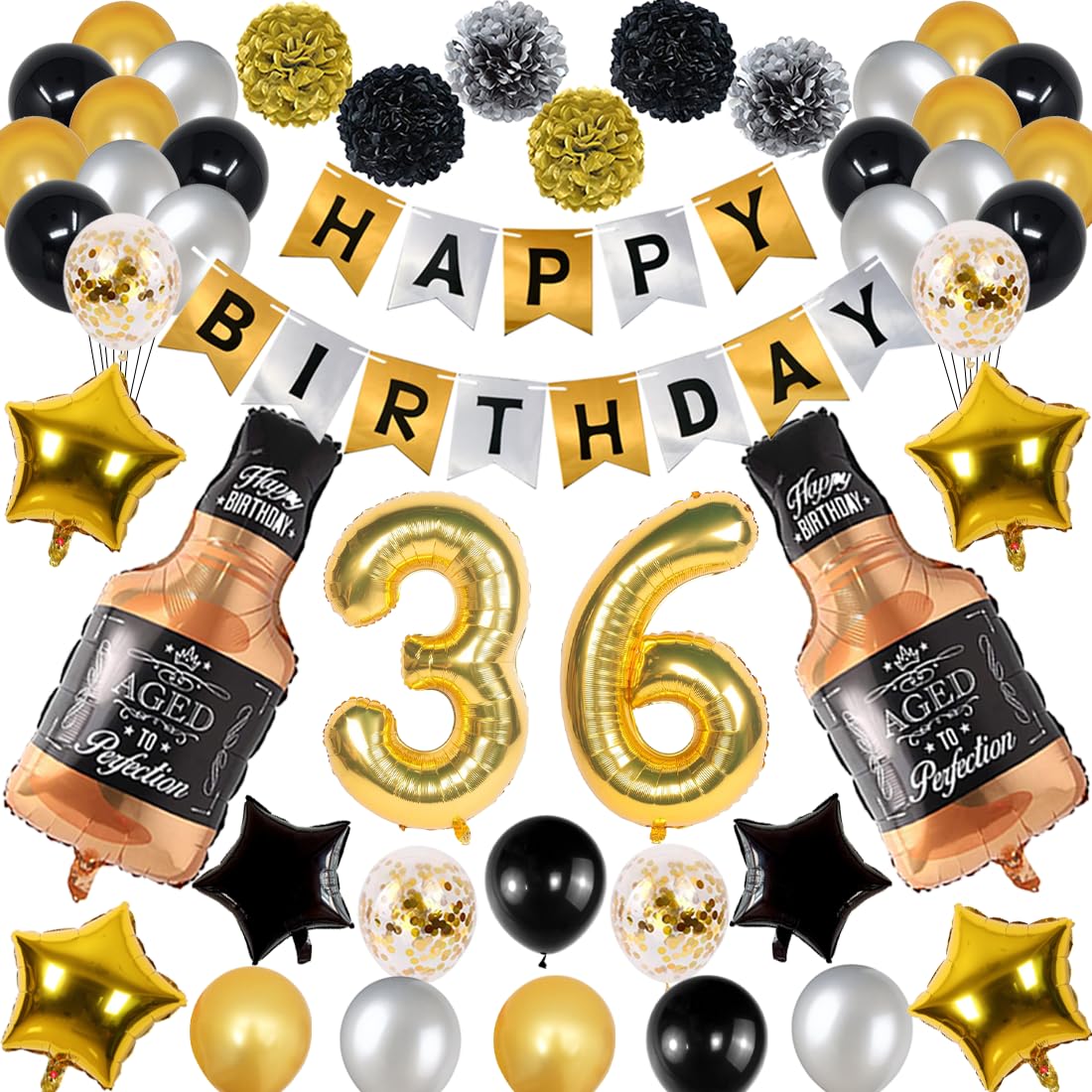 - Q: How many pieces are included in the birthday decoration set? A: The birthday decoration set includes a total of 45 pieces, which consists of 1 'HAPPY BIRTHDAY' banner, 2 whiskey bottle balloons, 4 gold foil stars, 2 black foil stars, 28 latex balloons, 6 pom-pom flowers, and 36 number balloons.