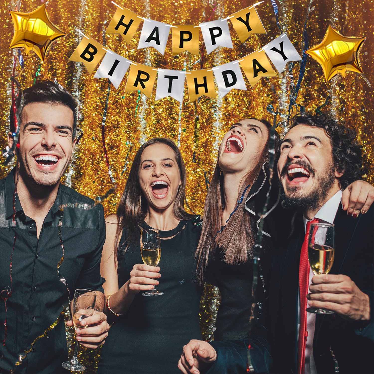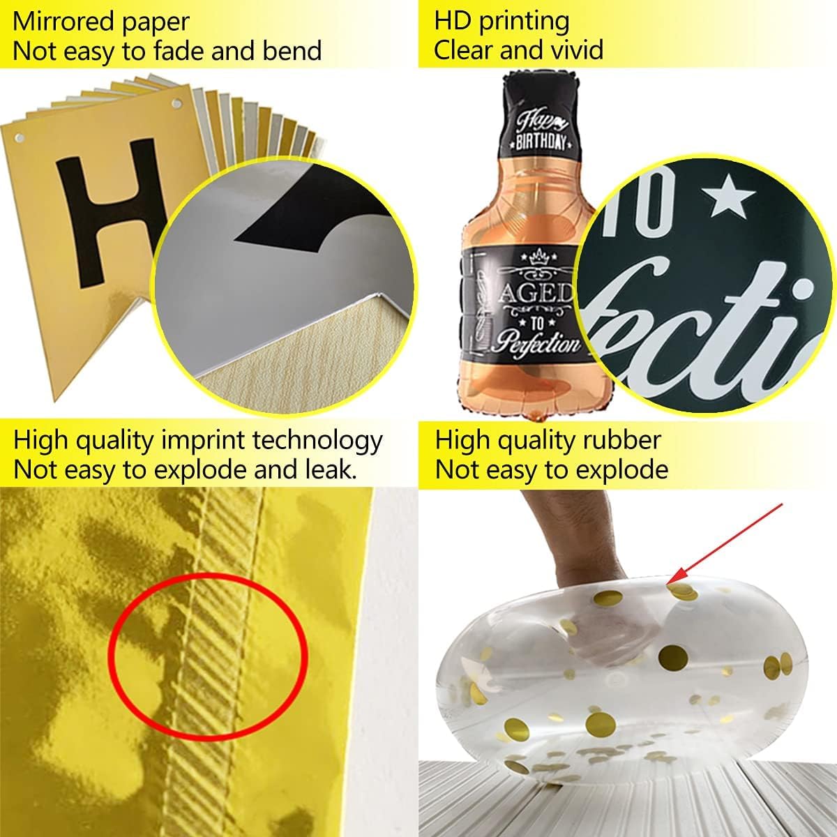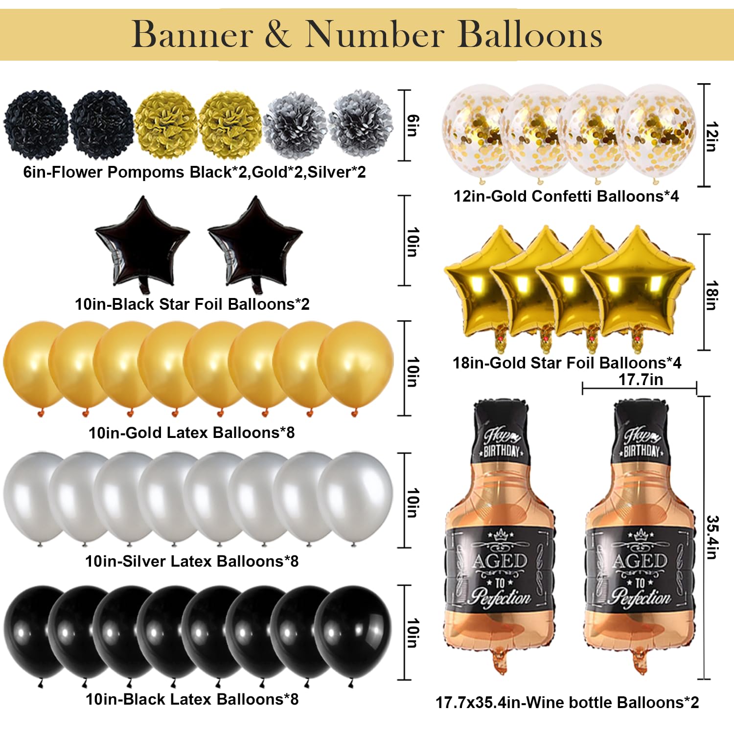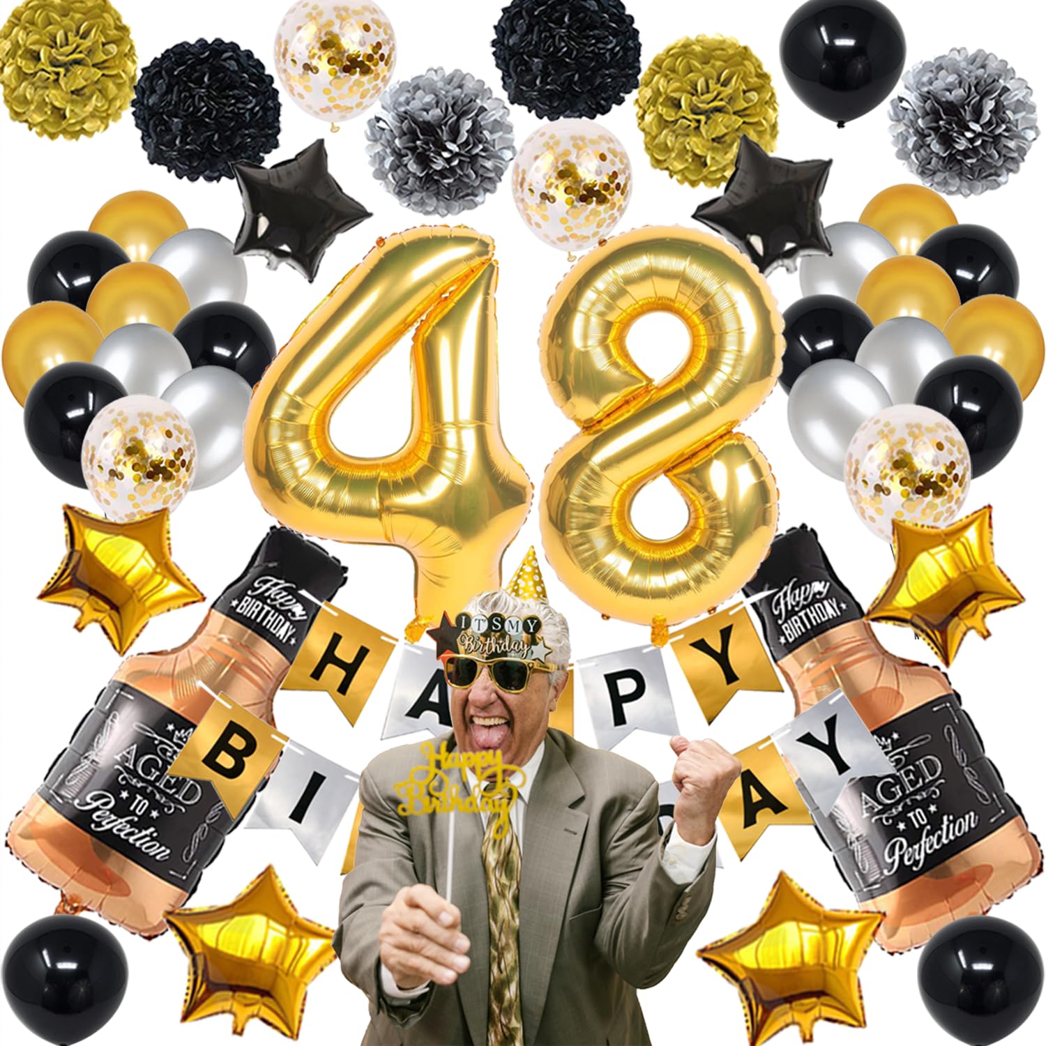 - Q: How many pieces are included in the birthday decoration set? A: The birthday decoration set includes a total of 45 pieces: 1 'HAPPY BIRTHDAY' banner, 2 whiskey bottle balloons, 4 gold foil stars, 2 black foil stars, 28 latex balloons, 6 pom-pom flowers, and 48 number balloons.