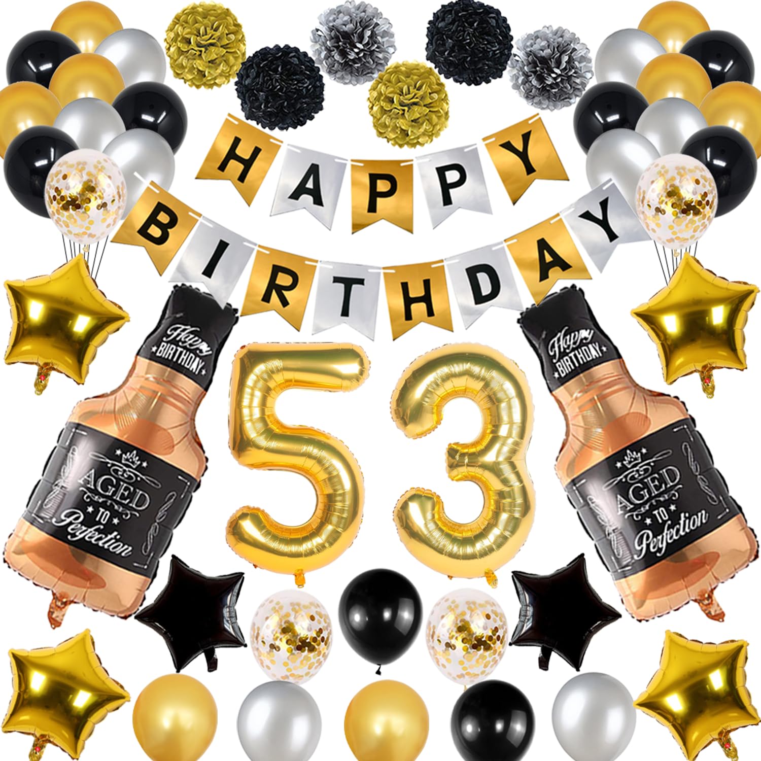 - Q: How many pieces are included in the birthday decoration set? A: The 53rd birthday decoration set includes a total of 45 pieces, which features 1 'HAPPY BIRTHDAY' banner, 2 whiskey bottle balloons, 4 gold foil stars, 2 black foil stars, 28 latex balloons, 6 pom-pom flowers, and 53 number balloons.