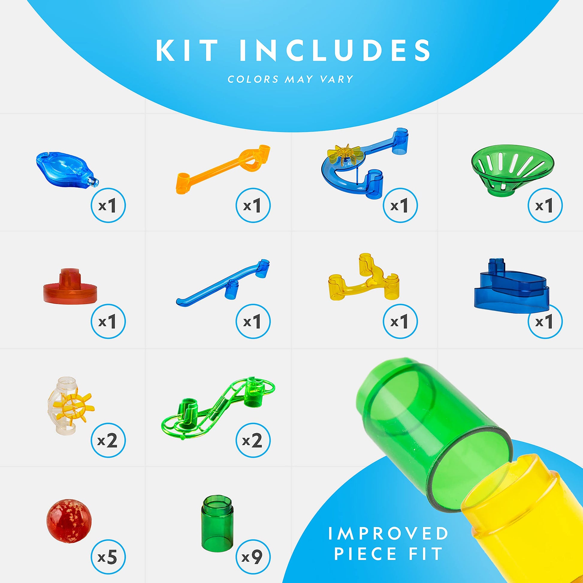 EXPAND YOUR MARBLE RUN - This expansion pack (not a stand-alone marble run kit) enhances National Geographic Glow in the Dark Marble Runs (non-magnetic) with 20 additional construction pieces that fit snugly so your marble maze won’t fall apart: 9 tube pieces, 9 action pieces, and 2 base pieces. | GLOW IN THE DARK MARBLES – add 5 new glow in the dark glass marbles to your collection and watch them shine bright as they zig-zag down the marble run. | UV LIGHT – a UV light comes with the expansion pack to help give your marbles the ultimate glow. | GREAT STEM TOY – the learning guide inside teaches about the physics of motion and aerodynamics. It also includes marble run construction experiments | HIGH-QUALITY EDUCATIONAL TOYS - We're proud to make the highest quality hands-on science toys, and all our products are backed by exceptional service.