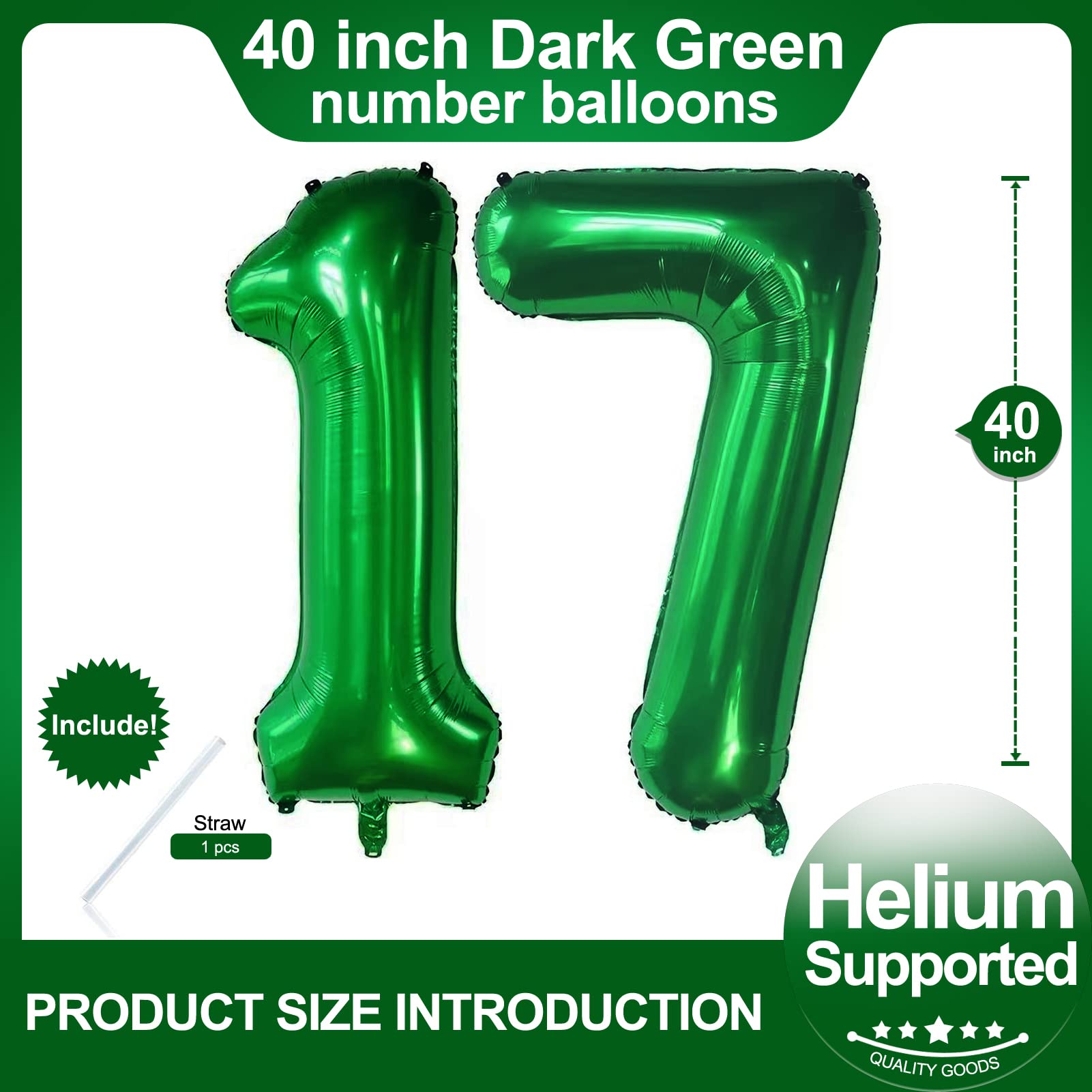 - Q: What is the size of the Dark Green 17 foil balloons? A: The Dark Green 17 foil balloons measure 40 inches, making them a striking addition to any 17th birthday party or anniversary celebration.