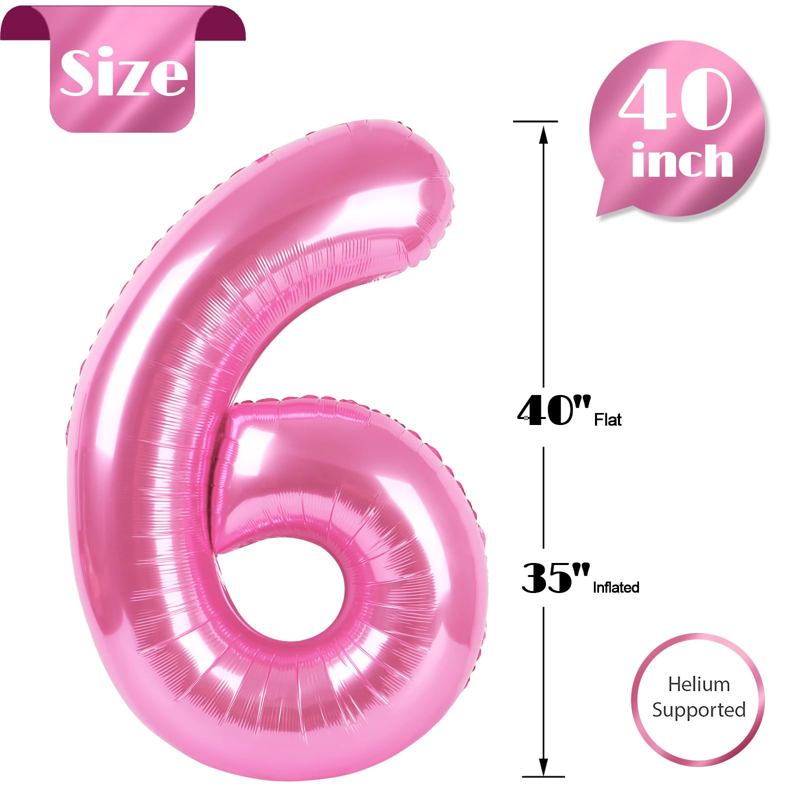 - Q: What is the size of the Pink Number 6 Balloon? A: The Pink Number 6 Balloon measures 40 inches, making it a bold and eye-catching decoration for any birthday celebration.