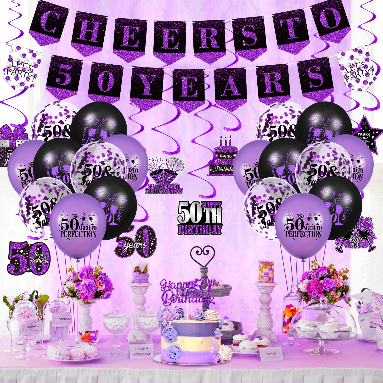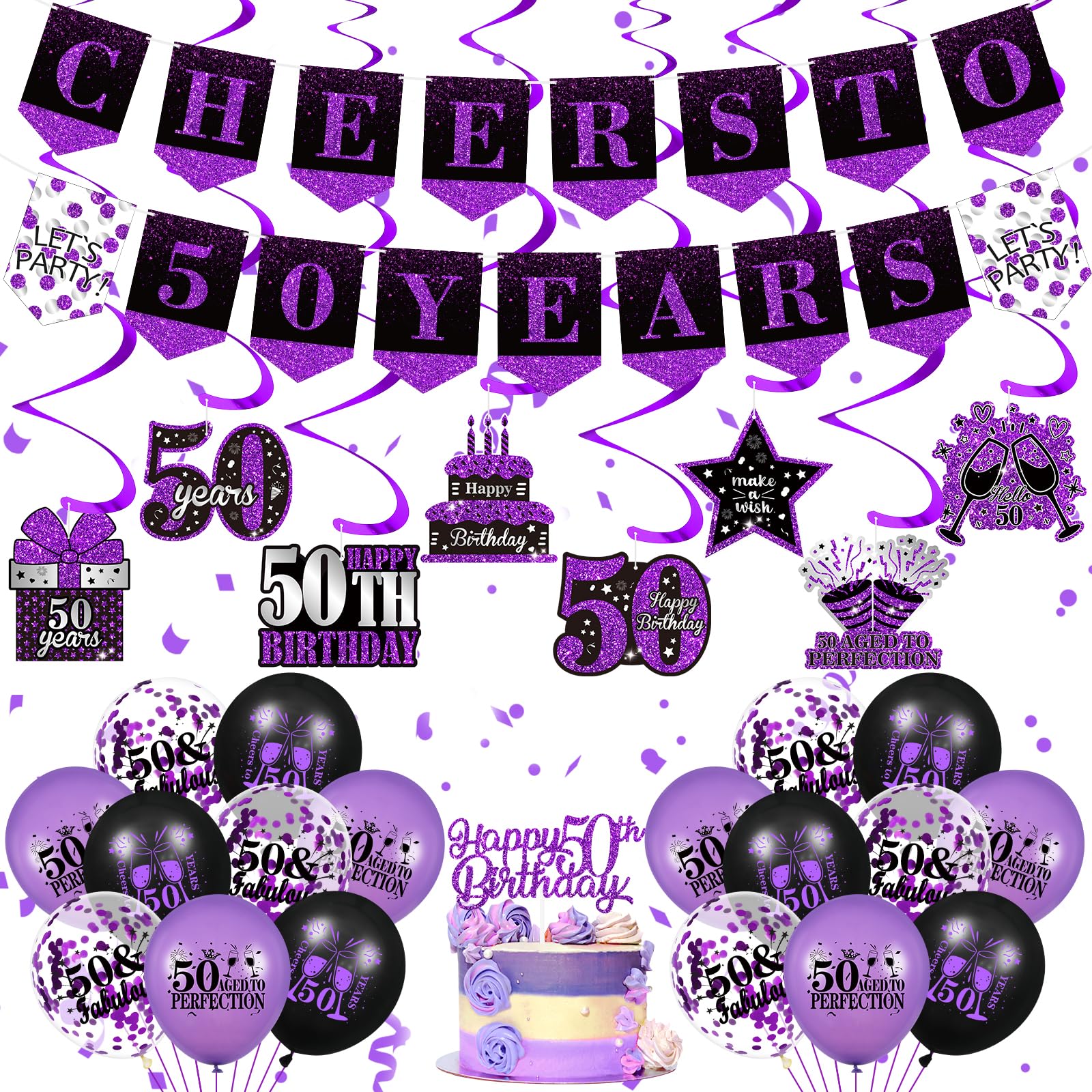 Purple 50Th Birthday Decorations For Women Men Purple Black 50Th Birthday Banner Hanging Swirls 50Th Birthday Balloons Happy 50Th Birthday Cake Topper For Purple Cheer To 50 Years Party Supplies