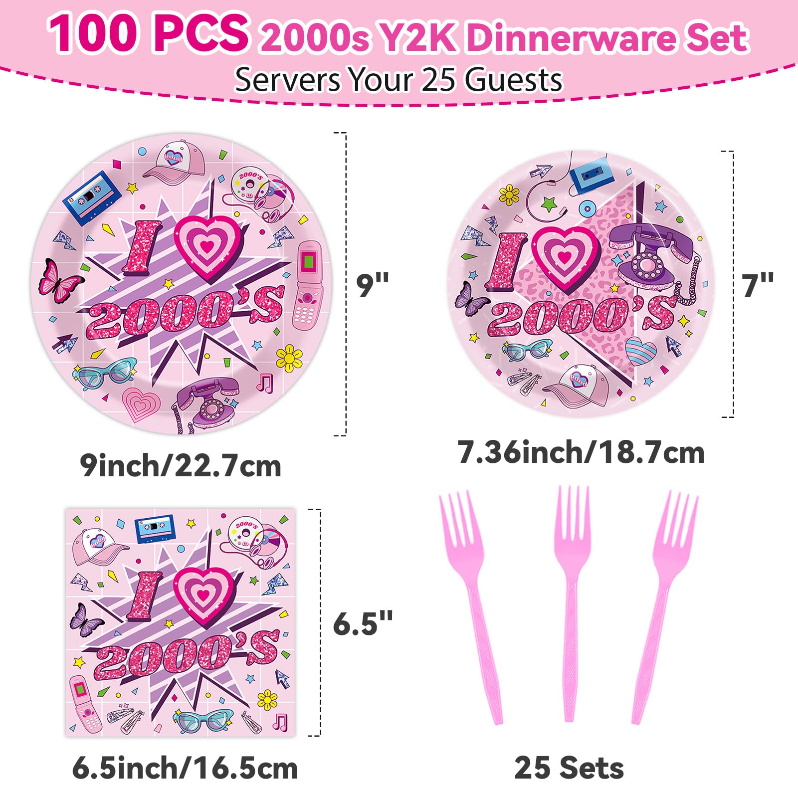Qyeahkj 100Pcs 2000S Party Supplies Pink Y2K Party Paper Plates And Napkins Disposable 2000S Theme Party Tableware Dinnerware Se