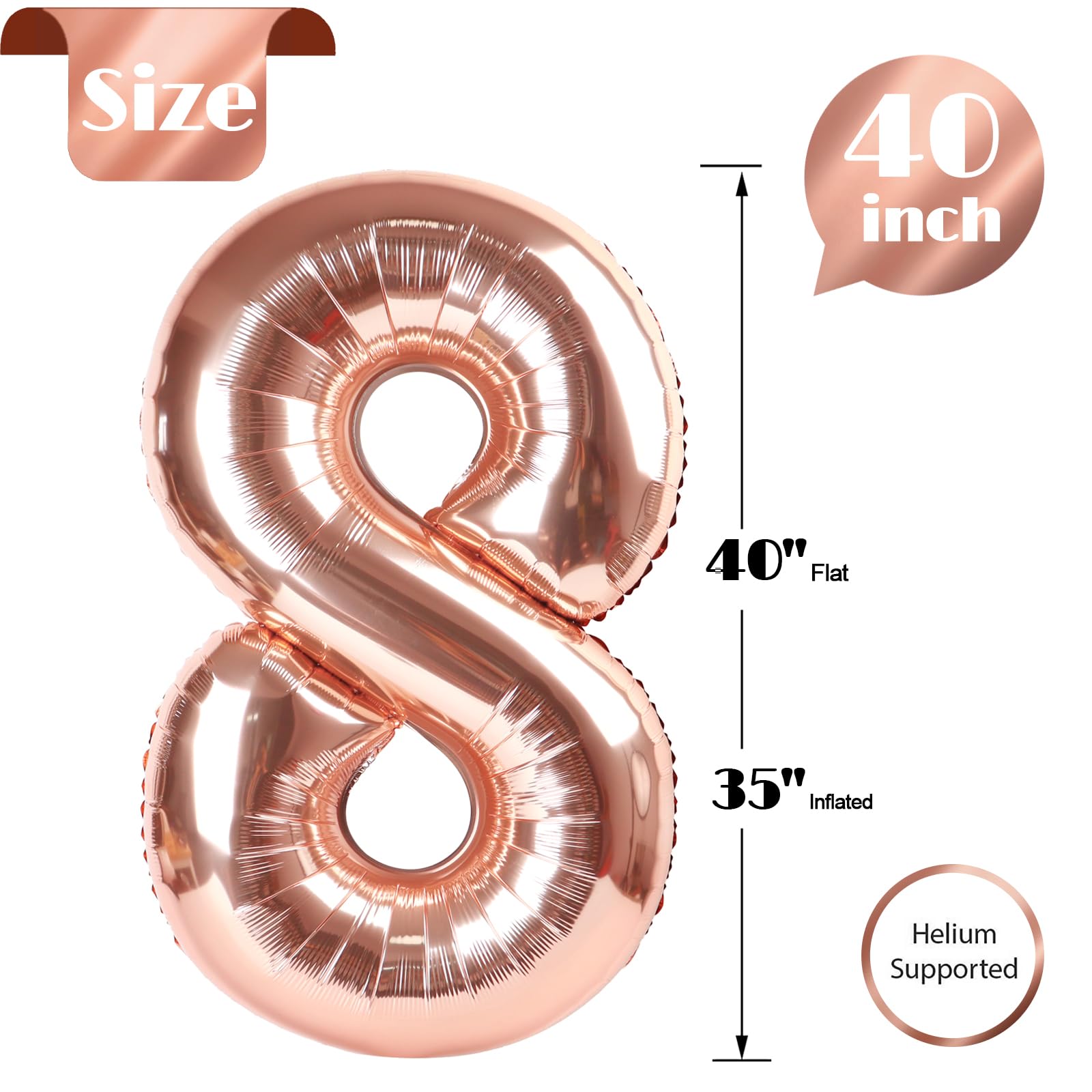 - Q: What is the size of the Rose Gold Number 8 Balloon? A: The Rose Gold Number 8 Balloon measures 40 inches, making it a striking centerpiece for any 8th birthday celebration.
