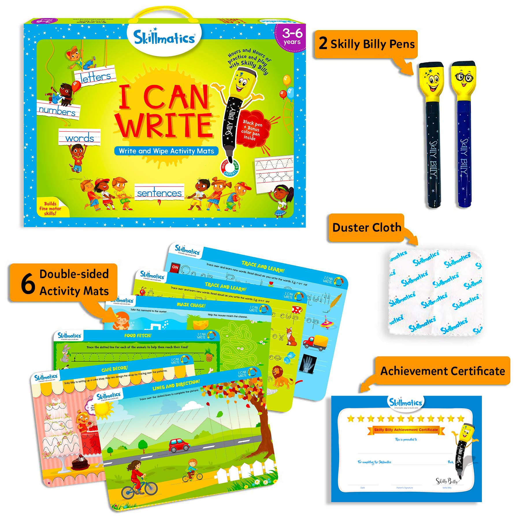 REUSABLE ACTIVITY MATS: I Can Write includes 14 repeatable activities designed to help kids strengthen their reading, writing, and problem-solving skills through practice and repetition!|INCLUDES: 6 Double-sided Activity Mats, 2 Skilly Billy Dry-erase Pens, 1 Duster Cloth and an Achievement Certificate.|AWARD-WINNING PRODUCT: Winner Of The 2022 Parents' Picks Awards as one of the Best Educational Products in the World.|LEARN THROUGH PLAY: Kids learn best through repetition! Our mats are easy to clean, allowing endless practice to reinforce and perfect their skills.|FUN EDUCATIONAL GAMES: Designed by educators and play experts, each mat offers engaging, age-appropriate activities that make learning exciting and enjoyable.|KEY LEARNING OUTCOMES: Learn patterns and strokes, alphabet, numbers, writing words, colors and shapes, body parts, calendar planning, and creating sentences.|ENCOURAGES INDEPENDENT LEARNING: With easy-to-follow activities, kids gain confidence as they explore and practice new skills on their own.|BEST GIFT FOR AGES 3 TO 6: A screen-free, educational gift that makes birthdays, Easter, Christmas, playdates, and any special occasion extra fun!