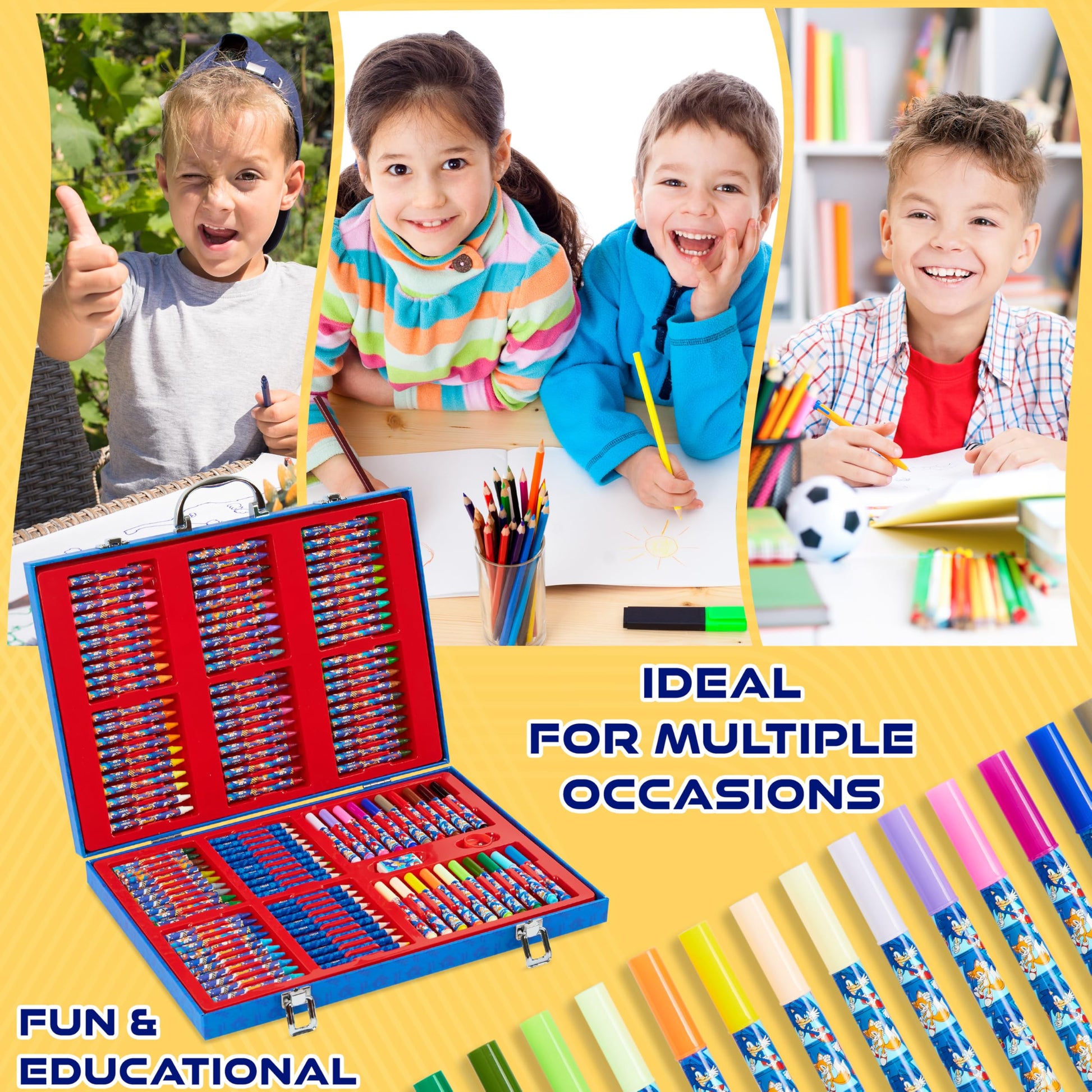 Unleash your childs imagination with the Sonic the Hedgehog Art Supplies Set-an epic 130+ piece coloring kit designed for boys ages 3 and up who love drawing, coloring, and crafts. This Sonic art kit includes 80 crayons, 20 short colored pencils, 20 washable markers, 10 fun coloring pages, 5 A4 sticker sheets, a pencil sharpener, and an eraser-all packed in a durable, hinged travel case thats easy to carry anywhere. Whether your child enjoys sketching Sonic, Shadow, or creating their own speedy adventures, this art set for kids is packed with tools to support creativity. Its perfect for arts and crafts, school supplies, or rainy-day fun at home. Kids can explore colors, blend with markers, fill in coloring pages, and decorate with stickers for kids while boosting motor skills and color recognition. Designed for hands-on, screen-free entertainment, this all-in-one kids art kit is a dream come true for fans of Sonic the Hedgehog. Great for birthdays, holidays, or back-to-school season, its a standout among Sonic gifts for boys. Ideal for children who love coloring supplies, drawing kits, sticker books, and fun craft sets. Give them a reason to smile with this exciting Sonic coloring kit-perfect for travel, playdates, or everyday creativity!