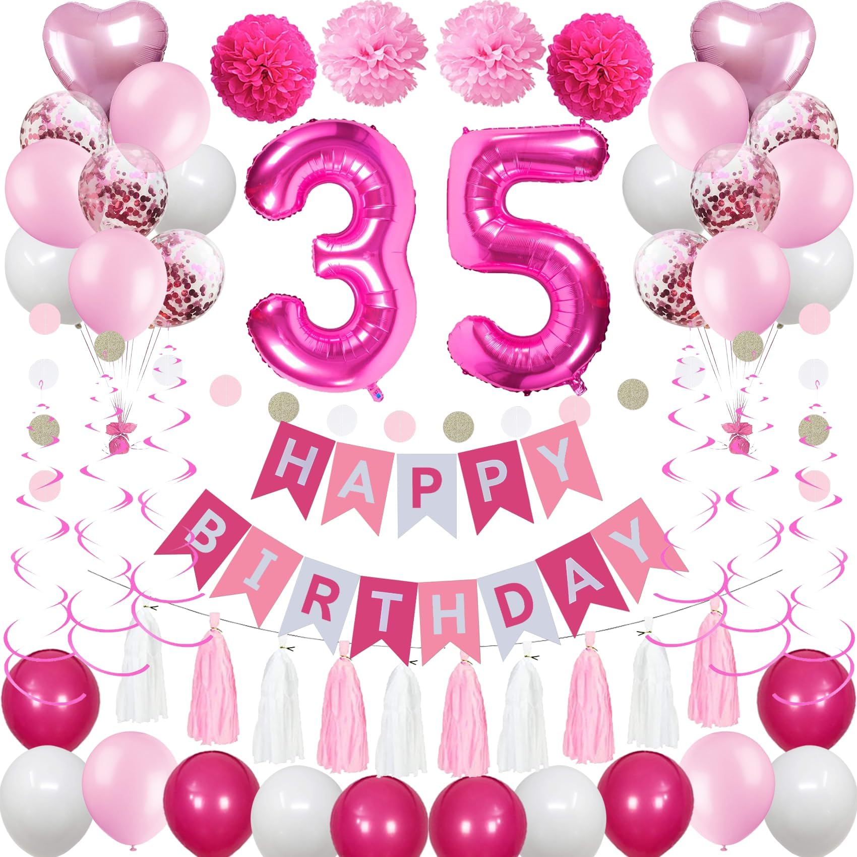 - Q: What is included in the Sweet 35th Birthday Decorations kit? A: The kit includes a 'HAPPY BIRTHDAY' banner, two number 35 foil balloons, six hanging swirls, a set of circle dots garland, ten tissue paper tassels (five white and five pink), twenty-two latex balloons in various colors, two pink heart foil balloons, and five paper pompoms.