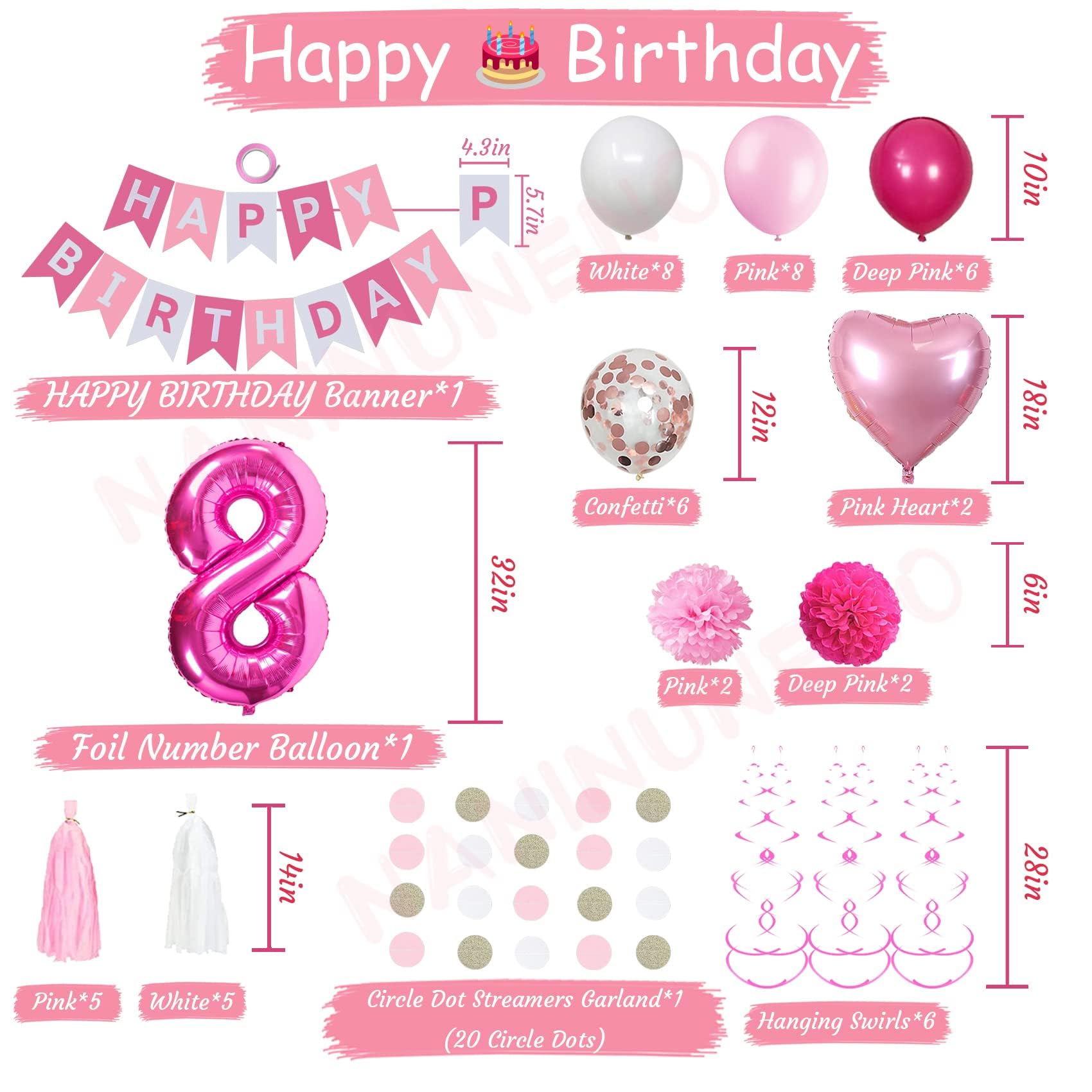 - Q: What items are included in the 8th Birthday Decorations kit? A: The 8th Birthday Decorations kit includes 53 pieces: a 'HAPPY BIRTHDAY' banner, number 8 foil balloons, 6 hanging swirls, a circle dots garland, 10 tissue paper tassels (5 white and 5 pink), 30 latex balloons (8 white, 8 pink, 6 deep pink, and 6 rose gold confetti), 2 pink heart foil balloons, and 4 paper pompoms (2 pink and 2 deep pink).