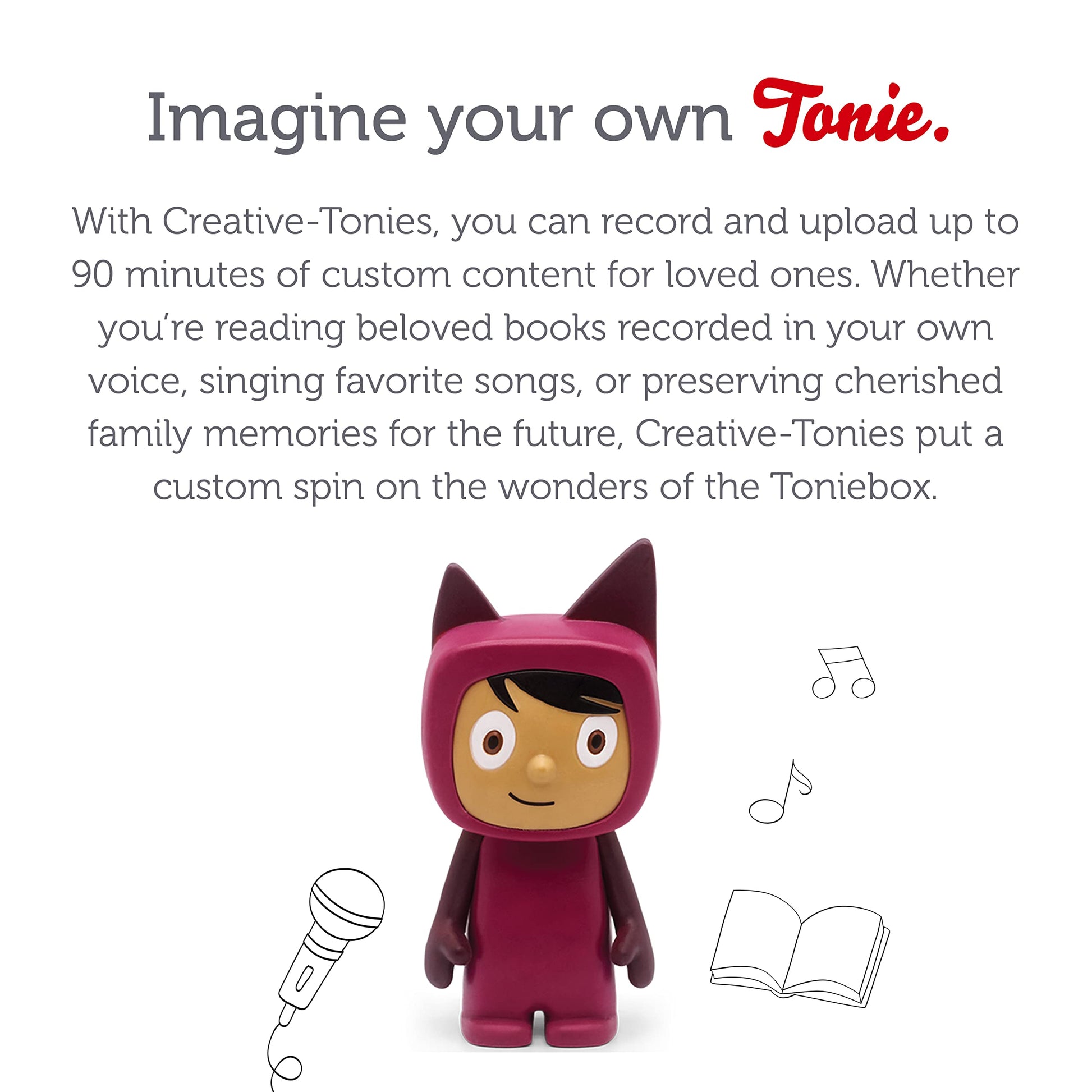 - Q: What is a Creative-Tonie and how does it work? A: A Creative-Tonie is a unique audio character that allows you to record and upload up to 90 minutes of your own stories and songs. You can easily upload audio content using the mytonies app on your smartphone, tablet, or computer, making it a fun and interactive way to share personalized audio experiences.