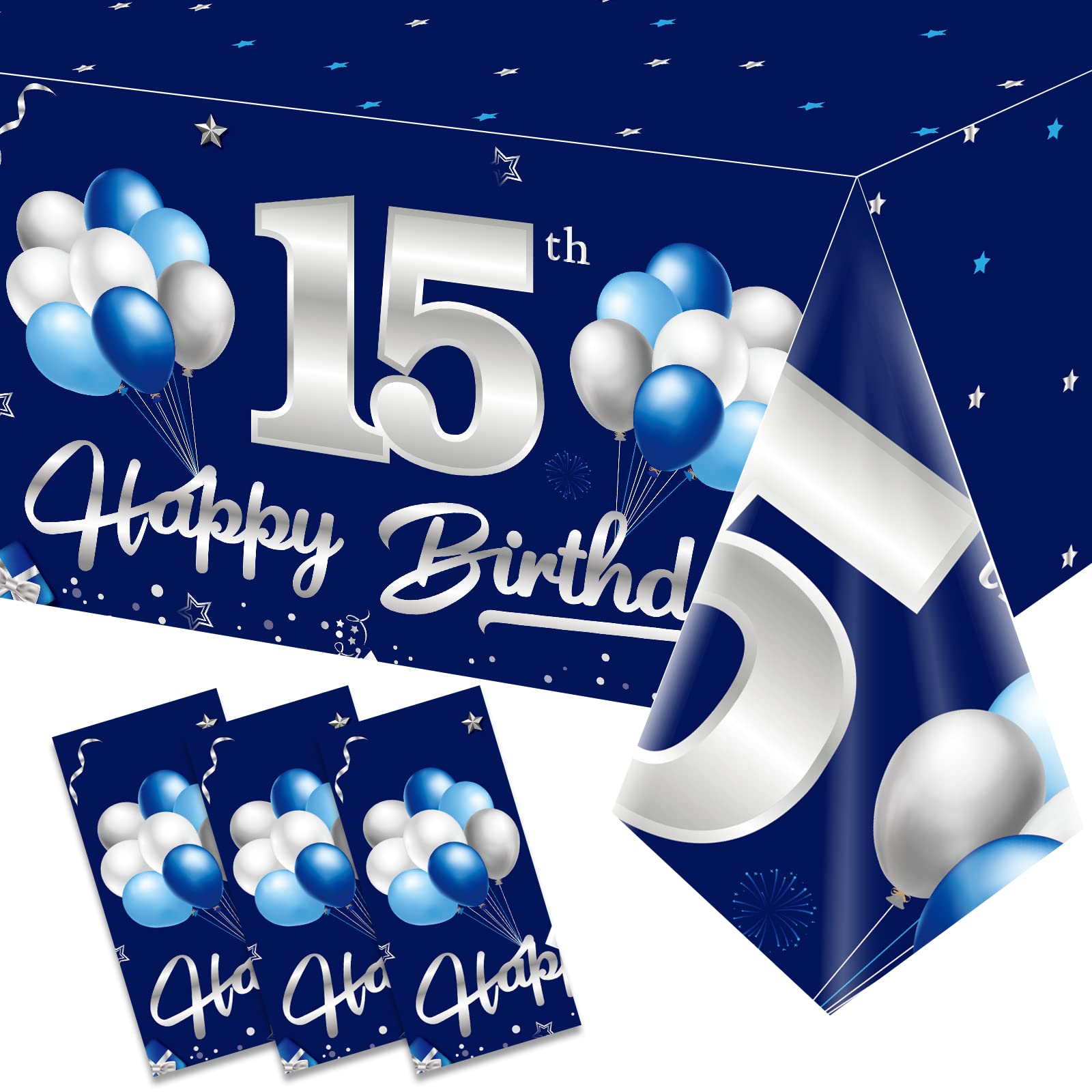 Turypaty 3 Pack Blue Silver 15Th Birthday Tablecloth Decoration For Boy, Navy Blue Happy 15 Table Cover Party Supplies, Fifteen
