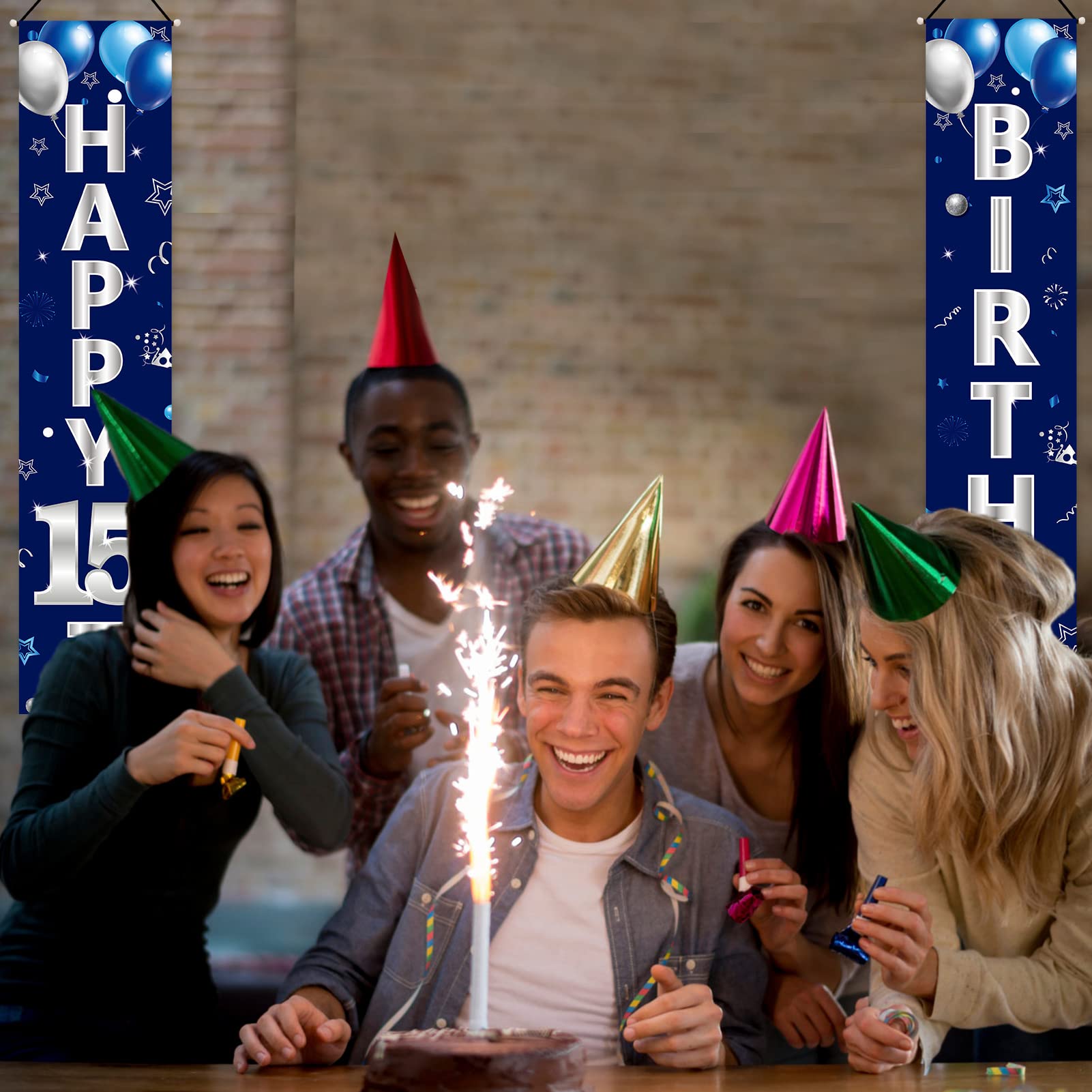 Turypaty Blue Silver 15Th Birthday Door Banner Decorations, Happy 15 Birthday Party Porch Sign Supplies For Boys, Sweet 15 Year