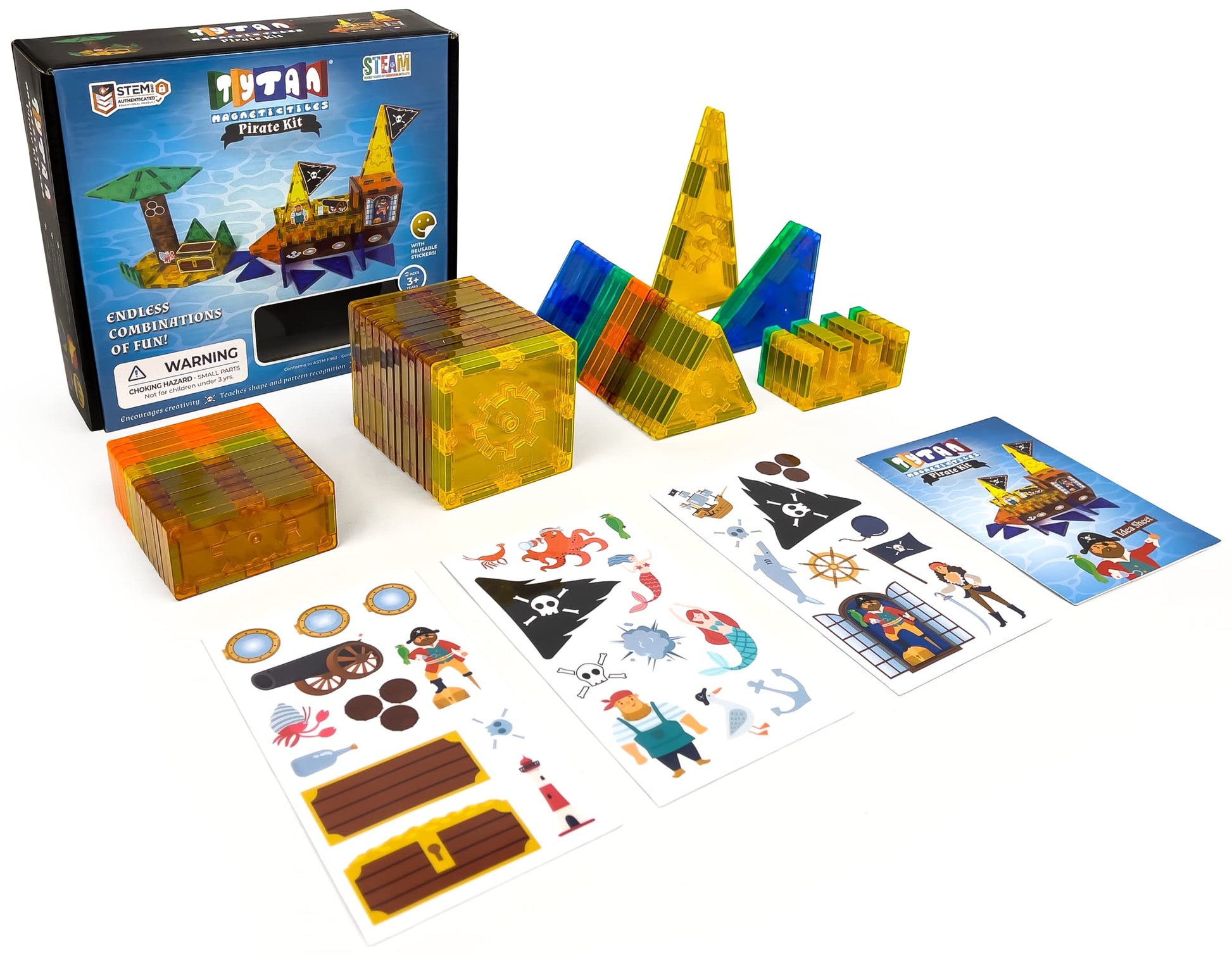 With 60 tiles of various shapes and sizes, kids can build the pirate vessel and island of their dreams. Different structures are possible with your little ones endless imagination! Children will get to explore their IMAGINATION and fine-tune their MOTOR SKILLS without sitting in front of a screen. With a simple click, these magnetic learning titles can bring to life numerous different creations and dreams. Every Tytan Tiles magnetic kit is certified by STEM.org as an educational tool to help develop STEM (Science, Technology, Engineering, and Mathematics) skills. Kids will get work with SHAPE AND PATTERN RECOGNITION, MAGNETIC PRINCIPLES, and ARCHITECTURAL BUILDING.The 60-piece kit from Tytan Tiles is made from environmentally friendly materials, is parent-tested, and has the highest level of CPSA child safety certifications. INCLUDES: 1 Tytan Tiles 60-Piece Pirate Magnetic Building Set and carrying bag for portability and stress-free storage. Beyond the building tiles of different shapes, multiple pirate themed sticker decals are included to help complete the look of your pirate creations!