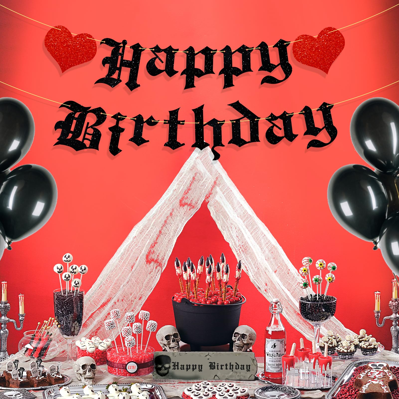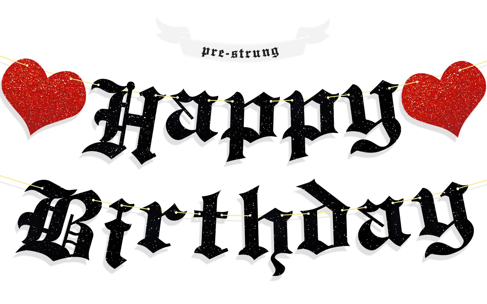 Ushinemi Pre-Strung Goth Birthday Decorations, No Diy Gothic Happy Birthday Banner Glitter Funeral Birthday Party Supplies