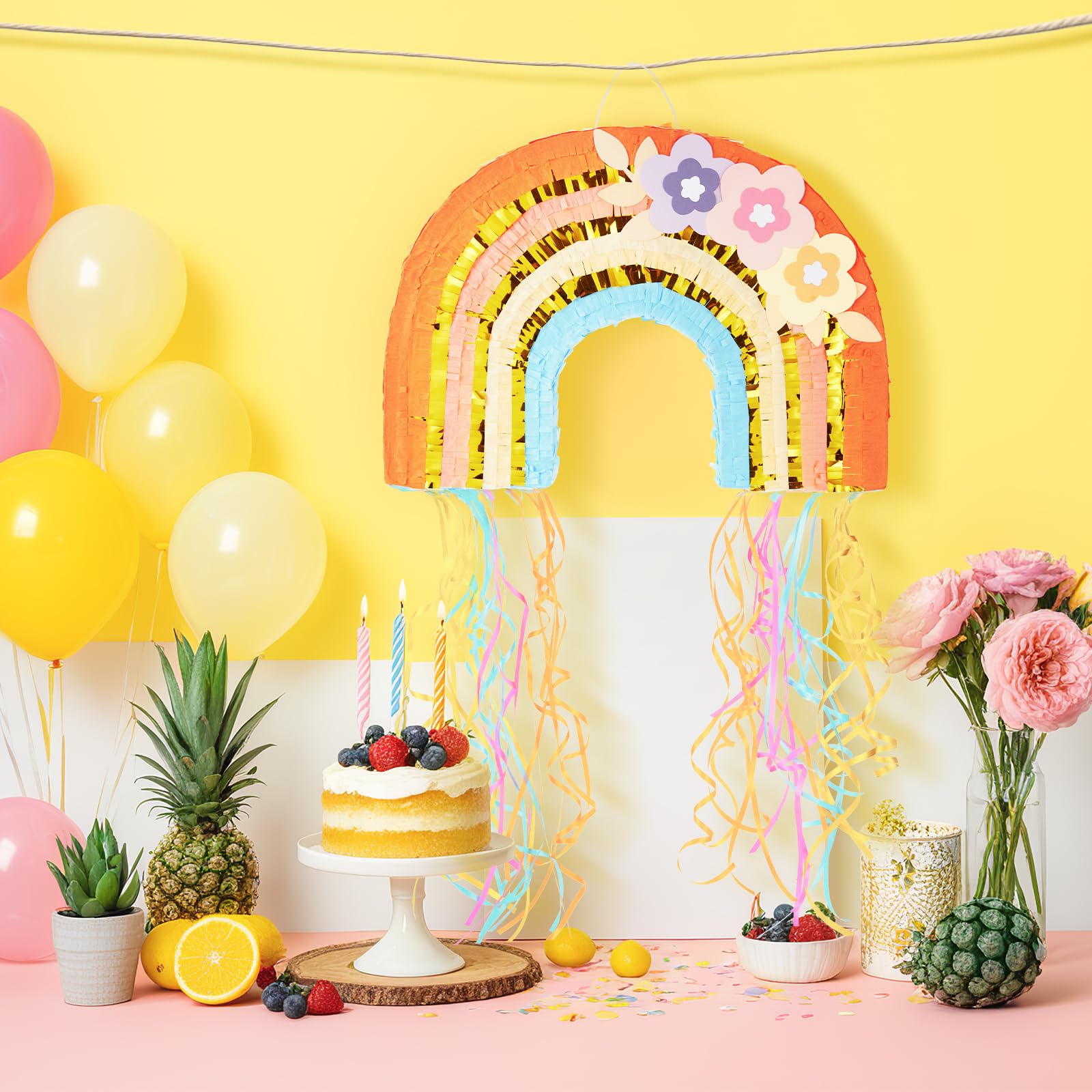 1.?Unique Design? - Our Boho Piñata Designed In Rainbow Shape, Decorate With Vibrant Flowers And Ribbons. The Colorful Kids Piñata Will Bring The Happy Summer Vibes To Your Theme Party. 2.?Superior Material? - Made Of Corrugated Paper, And Decorated With Golden Shiny Paper On Bond Paper. Our Kids Rainbow Piñata Is Not Only Visually Stunning But Also Durable, Ensuring That It Can Withstand All The Excitement And Enthusiasm Of The Party. 3.?Package Contains? - You Will Receive 1 Piece Rainbow Piñata, 1 Orange Blindfold And A Colorful Knocking Stick. Easily Bring You An Unforgettable Party Game Experience. 4.?How To Play? - Fill The Piñata With Confetti, Candies, Snacks, Little Toys, Gifts Or Other Small Fillers To Your Liking. Then Invite Your Party Guests To Hit The Piñata In Turn Until It Releases Your Piñata Surprise. Watch As Laughter And Joy Fill The Air, Creating Unforgettable Memories For Everyone Involved. 5.?Perfect Party Supply? - From Backyard Barbecues, Pool Party, Fiestas To Birthday Bashes, Our Vibrant Colorful Rainbow Piñata Will Stand Out At Any Celebration. Combine It With Other Party Decorations For A Cohesive Theme To Let The Festivities Begin!