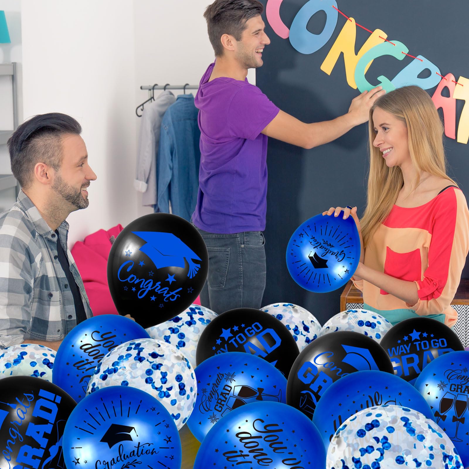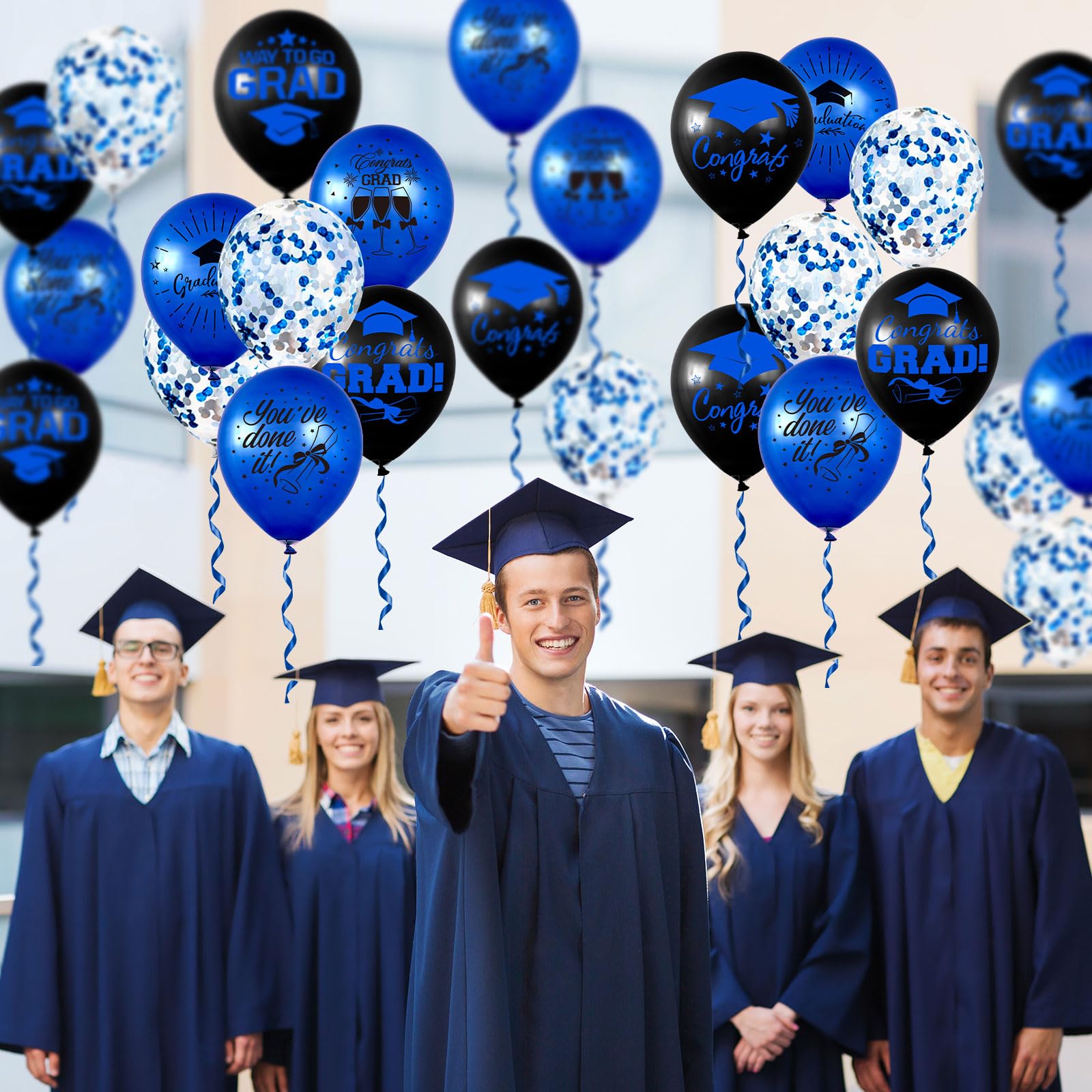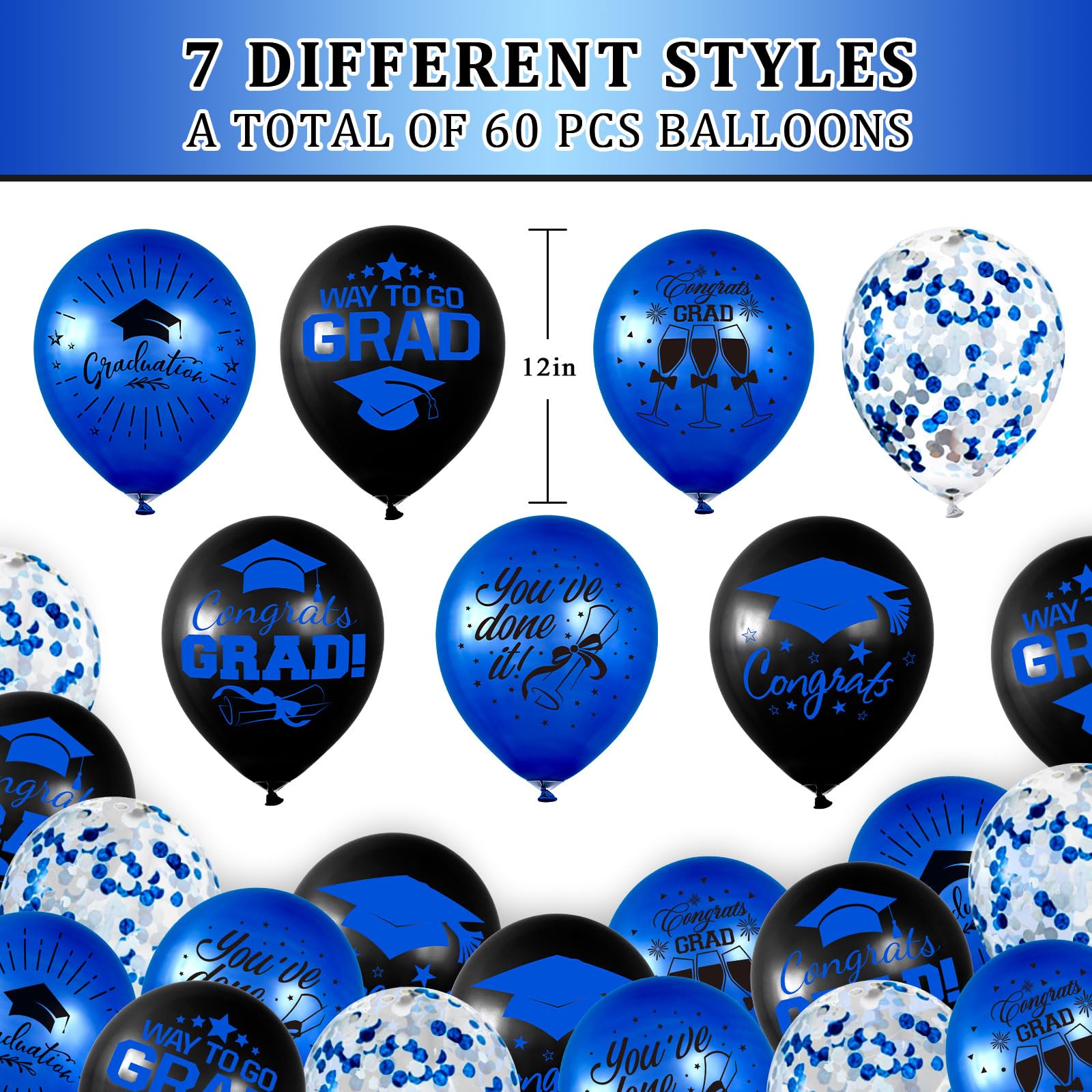 Whaline 60Pcs Graduation Party Balloon Set 7 Designs Confetti Latex Balloon With 2 Rolls Ribbon Grad Cap Congrats Grad Balloon For Graduation Party Decoration Supplies (Blue, Black)