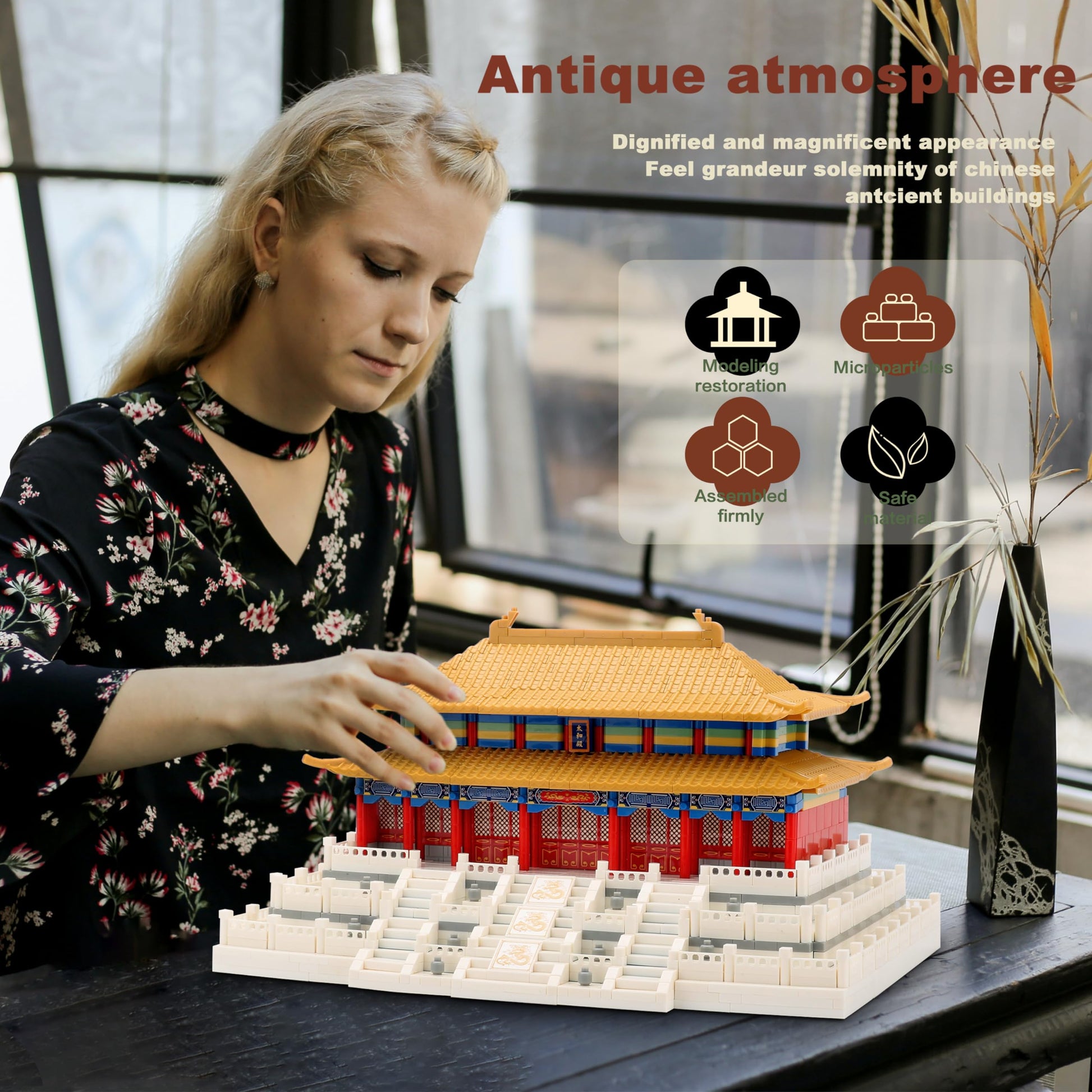 • Q: What are the dimensions of the completed Hall of Supreme Harmony model? A: Once assembled, the model measures approximately 5.4 inches in length, 6.9 inches in width, and 9.4 inches in height, making it a striking display piece.