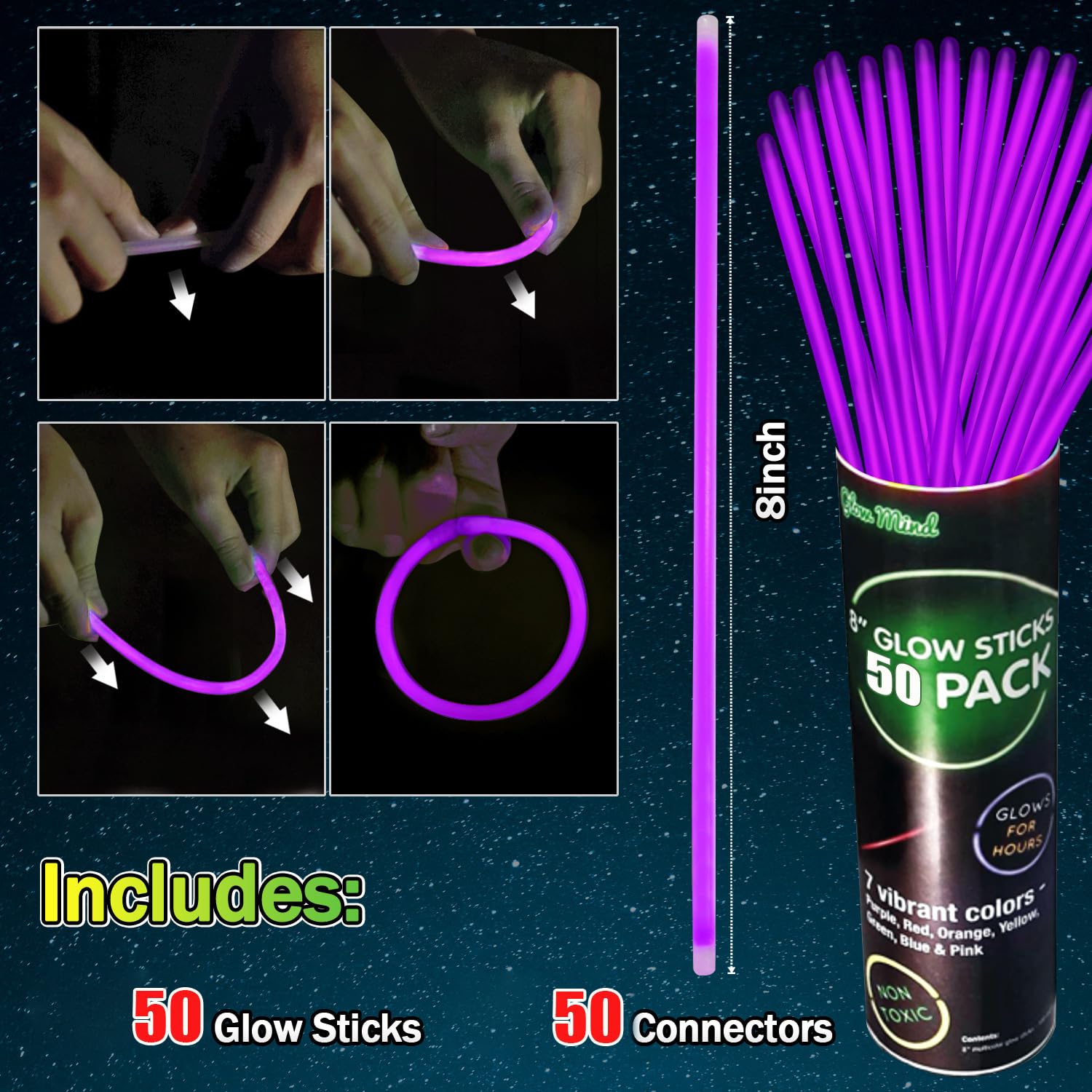 - Q: What is included in the YOFOBU glow sticks package? A: The package includes 50 individual purple glow sticks, each 8 inches long, along with 50 connectors, allowing you to create bracelets or necklaces for added fun.