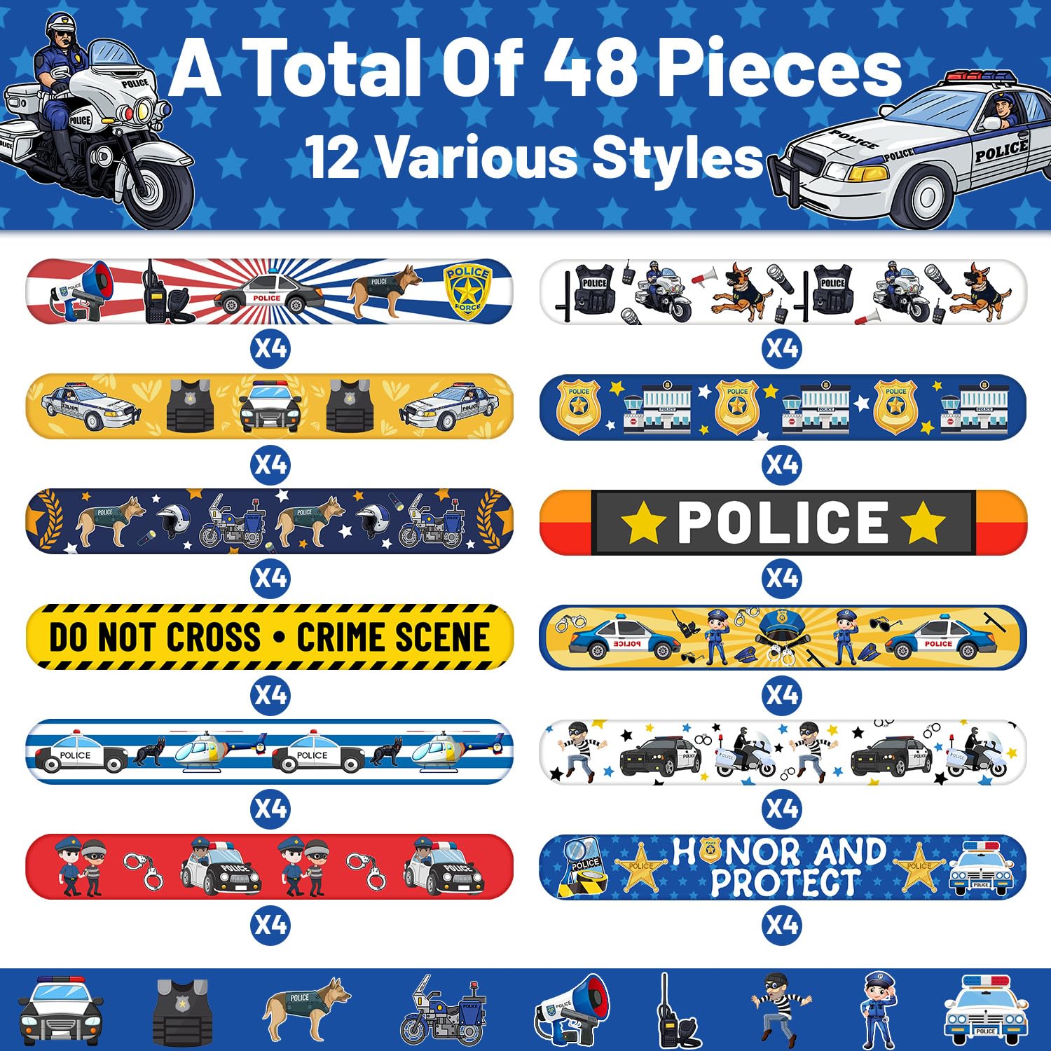 Variety Style : Officer Party Favors includes 48pcs police slap bracelets, there are 12 different designs (4 pieces for each style), Enough quantity to meet your party needs! Police Party Favors: Give these cool police themed party supplies to your friends and classmates, or you can give them to your children to cultivate children's thinking and learning abilities, perfect gift for class game prizes, gift bag stuffing and more. Materials:PVC These police slap bracelets are made of safe and harmless materials, which is safe for children to wear, not easy to break or fade ,light and portable, you can wear it for a long time! Specifications: Color: Multicolor Size: approx 22 x 3 cm/ 8.67 x 1.18 inches