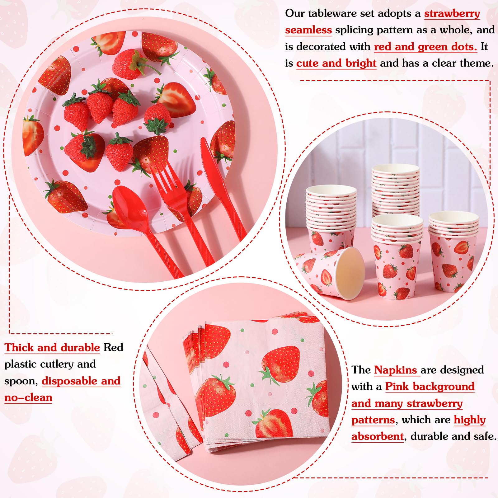 Features: Ideal size: These strawberry party supplies have been designed in an ideal size for most ages to enjoy. The 7 inch and 9 inch plates can cater to different meal portions, while the 9 oz cups are suitable for quenching your thirst. Practical gift option: Gifting strawberry party decorations is a thoughtful gesture for friends and family who love hosting parties. Not only are these sets practical, but they also add a cute aesthetic to the event with their lovely strawberry design. Specifications: Material: Plate, cup, napkin: paperKnife, fork, spoon: plasticColor: as shown in picturesSize: Plate: 7 inches, 9 inchesCup capacity: 9 ozPackage includes: 50 Pcs 9 paper plates50 Pcs 7 paper plates50 Pcs 9 oz cups50 x Napkins50 Sets of cutleryNotes: Manual measurement, please allow slight errors on size. The color may exist a slight difference due to different screen displays. Please don t put them in the microwave.