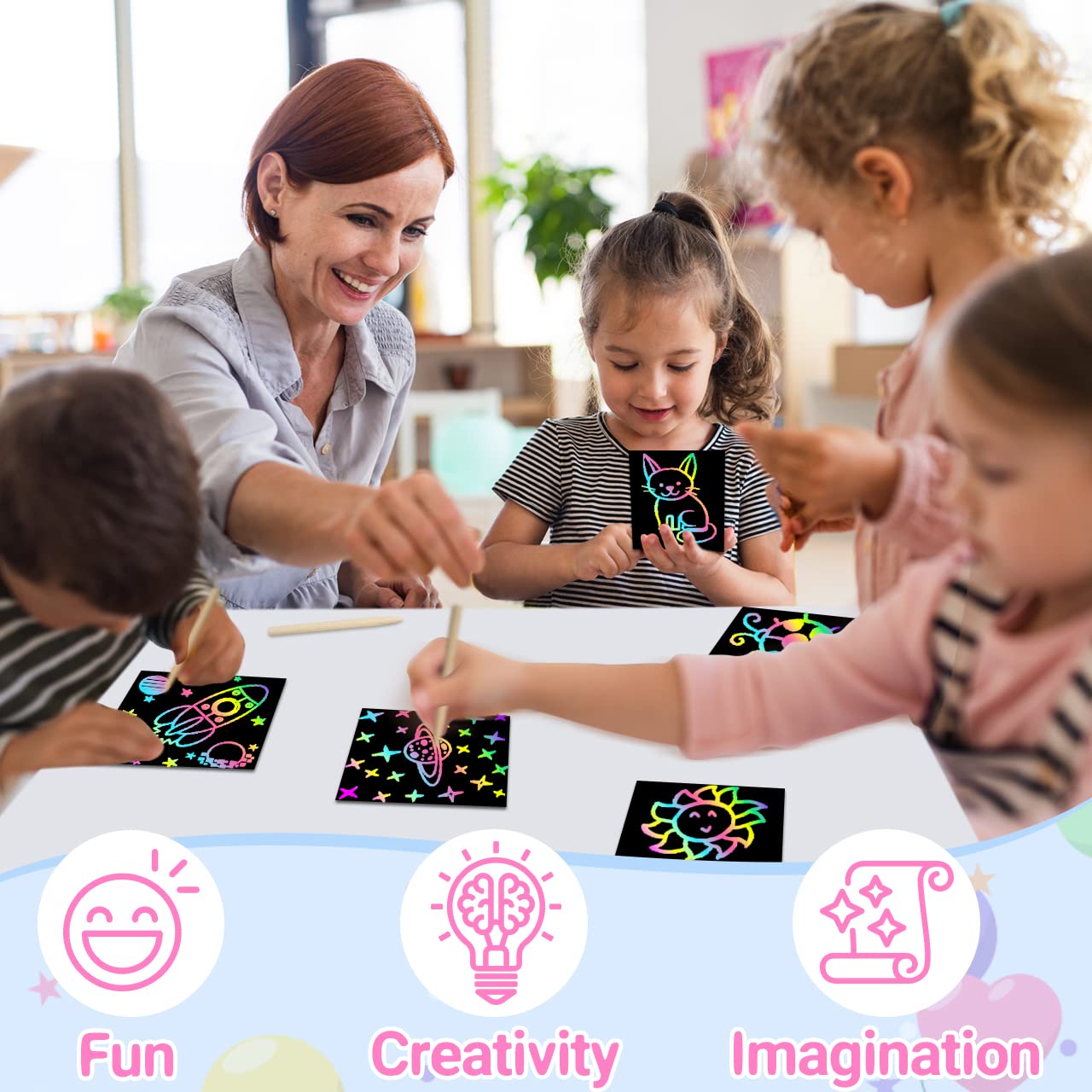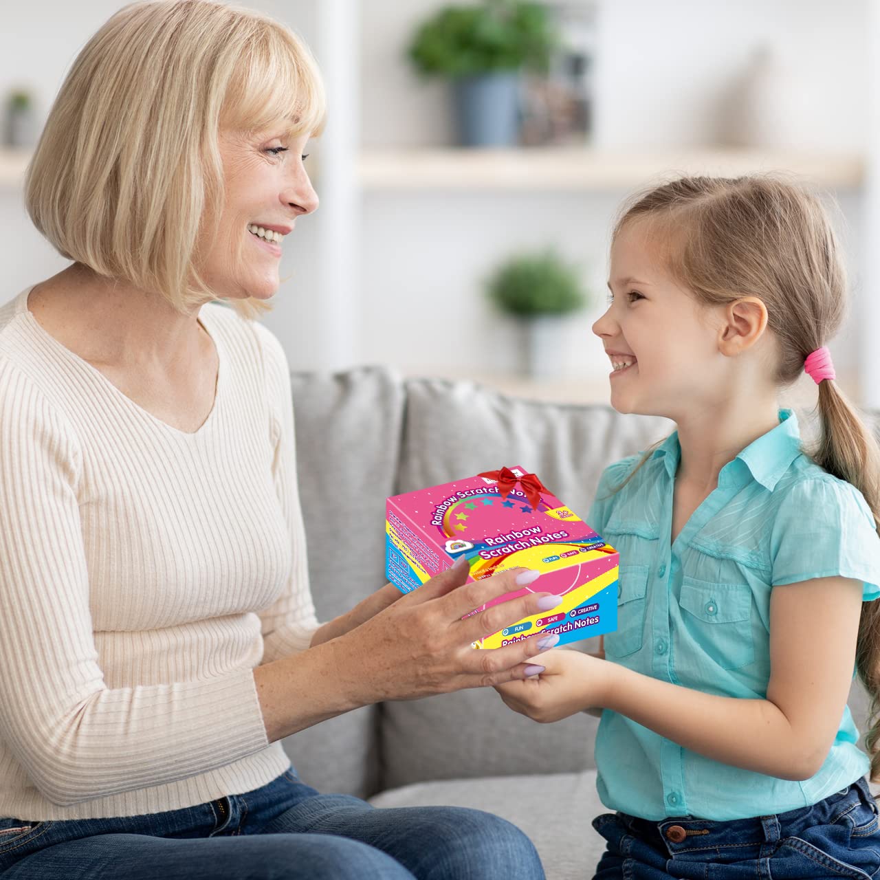- Q: What is the size of each scratch note? A: Each scratch note measures 3.5 inches by 3.5 inches, making them a convenient size for kids to carry around and use for various creative projects.