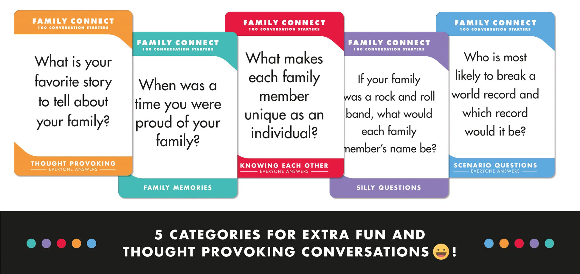 - Q: What types of questions are included in the card game? A: The card game features 100 engaging conversation starters divided into five categories: Family Memories, Knowing Each Other, Silly Questions, Scenario Questions, and Thought-Provoking Questions, ensuring a wide range of topics for every family discussion.