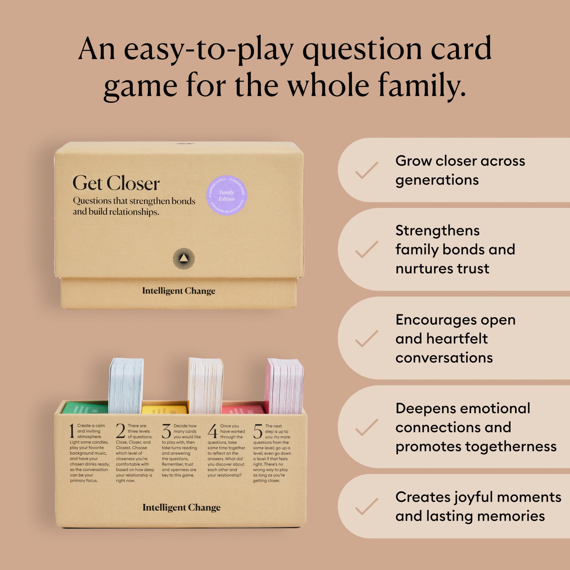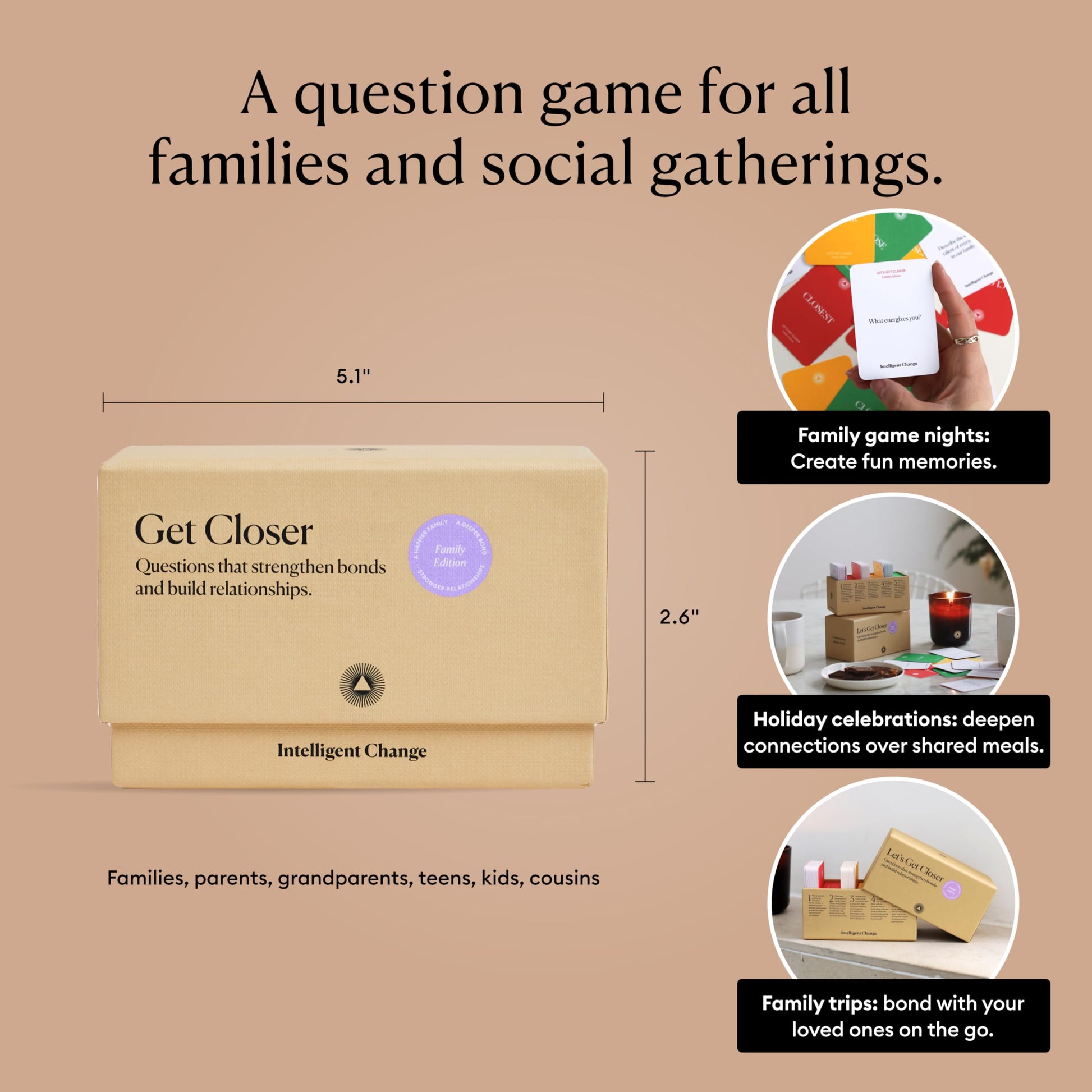 - Q: What age group is the Intelligent Change Get Closer Family Bonding Question Card Game suitable for? A: The Get Closer Family Bonding Question Card Game is designed for families of all ages, making it suitable for children, teenagers, and adults alike. It encourages intergenerational conversations, helping everyone to connect and share experiences.