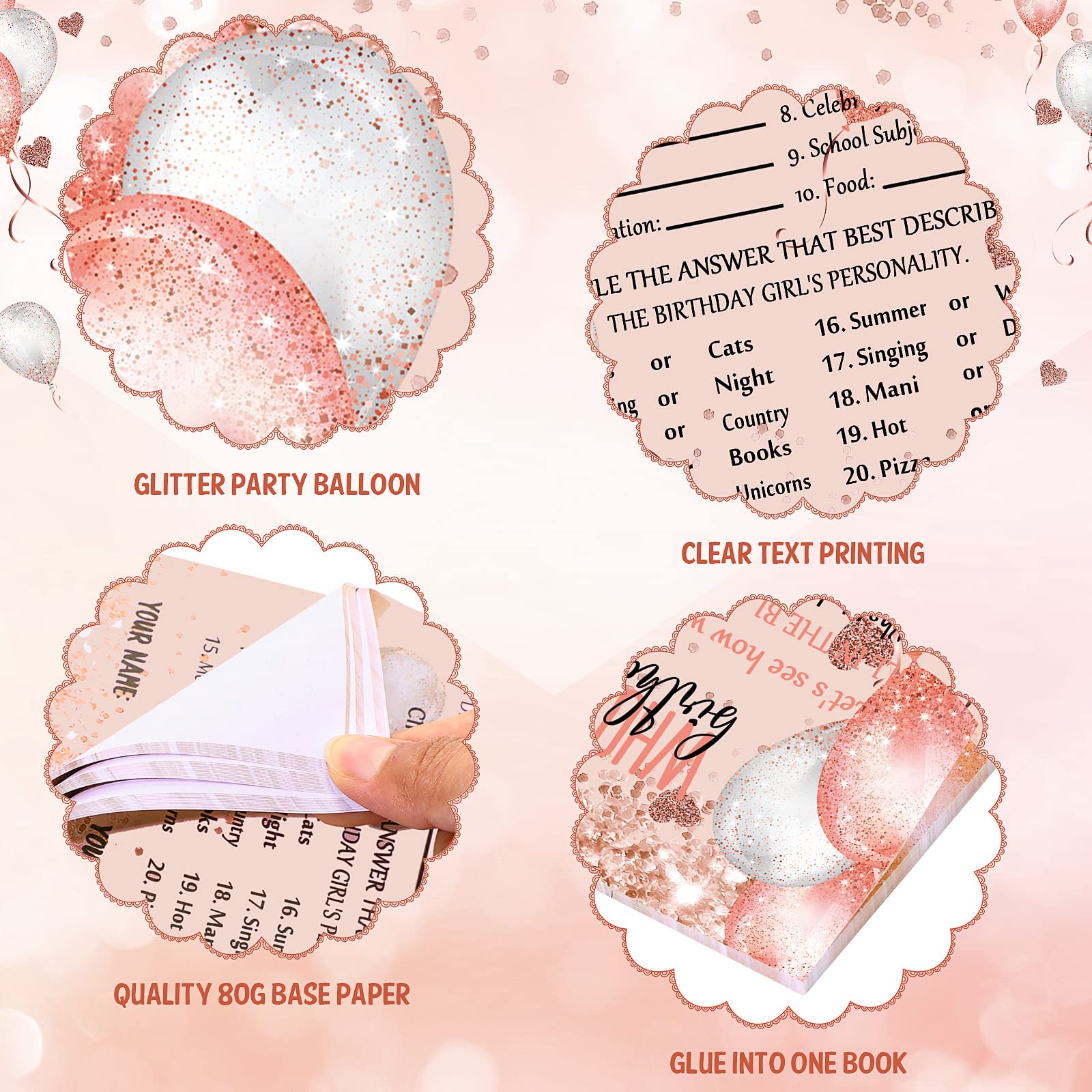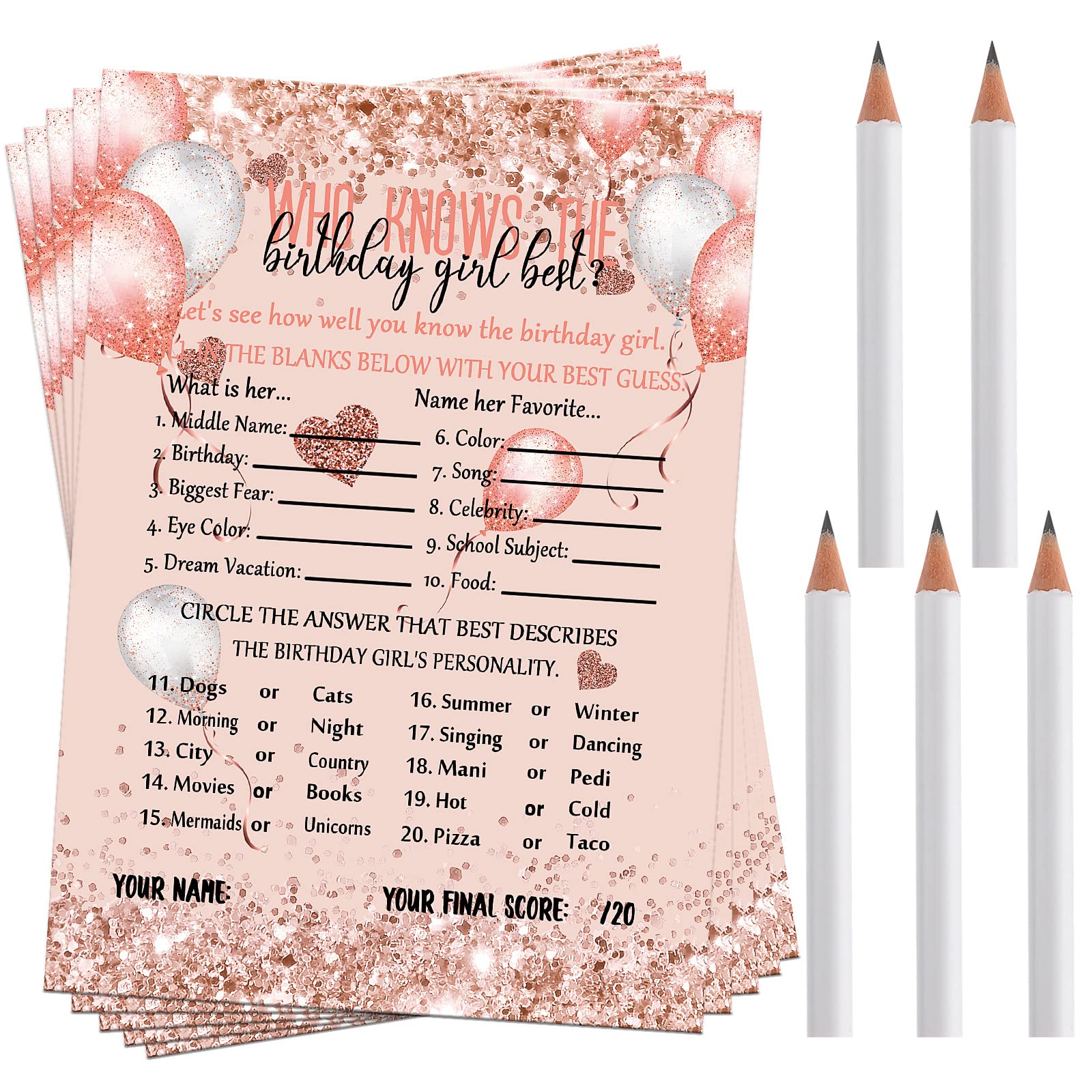Leinuosen Who Knows The Birthday Girl Best Card, 50 Pcs Birthday Party Game Set Girly Pink Rose Gold Sprinkles Themed Birthday C