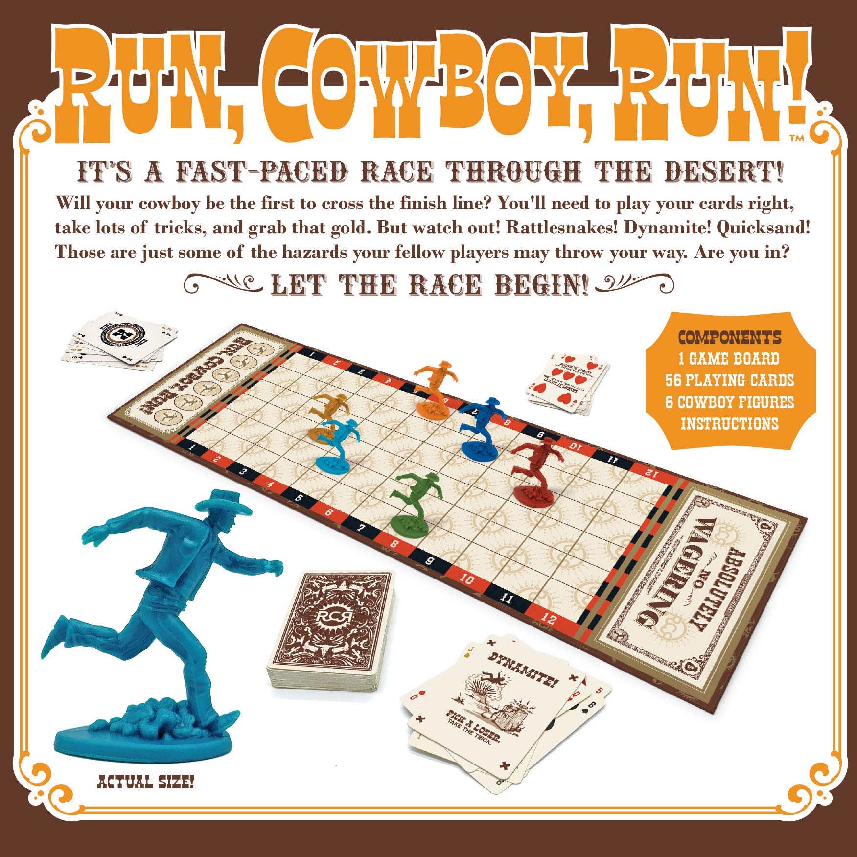 Run, Cowboy, Run! - The Fast-Paced Card Game Of Running Cowboys, Perilous Hazards .... And Gold! It'S A Fast Paced Race Through The Desert, Will Your Cowboy Be The First To Cross The Finish Line? Beware: Rattlesnakes! Dynamite! Quicksand! This 'Trick-Taking' Card Game Includes 56 Playing Cards, Game Board, Instructions And 6 Cowboys. It'S Easy To Learn And Fast To Play - Great For Party Nights, Travel And Vacations. If You Can Play Hearts, Spades, Or Euchre, You Can Play Run, Cowboy, Run! 2 - 6 Players, 5 Min. To Learn, 10 Min. To Play