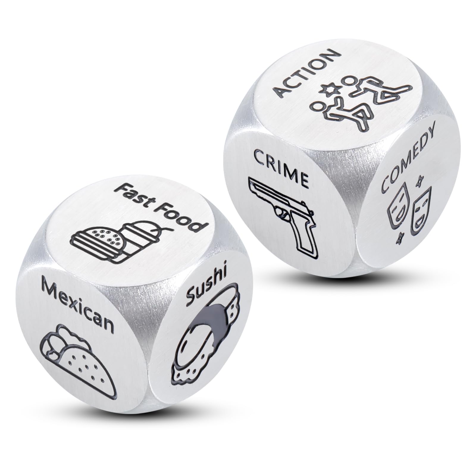 ?This set of funny dice game will add excitement to each other. At what to eat, what movie to watch, roll the dice, it will tell you the answer. Roll the dice and make your partner suffer the consequences in this game of chance. ?Perfect date night ideas dice, valentines day gifts for him her, women men valentines day gifts, valentine gifts for him her, valentines day gifts for boyfriend girlfriend, wife husband valentines day gifts for him, valentines gifts for him her, mens valentines gifts, anniversary gifts for him, anniversary gift for her, anniversary gift for couple, 11th anniversary steel gifts, steel anniversary gifts for him her, birthday gifts for women men, wedding gifts, sweetest day gifts for him her, gag gifts, Christmas gifts for women men, Stocking Stuffers for women men. About Eulalia Eclogue: When Eulalia was a kid, She received birthday gift with message beside her family gifts from her father since he was too busy to celebrate with her. On her graduation from College, she was surprised to finding that a gift on table, she cried for joy and accepted her boyfriends proposal. Decider dice always remind her of the gift, the loving message; of how much she was loved by her father, husband and family.Eulalia decided to make out something unique and sturdy, that could last on the decider dice inspiring family and friend, Women and Men. Thats your Eulalia Eclogue decider dice tag. We focus on: -making decider dice engraved with words;-encouraging special someone to live a life of love. We have: -the most stylish designer; -professional technical engineers; -qualified auditors; -passionate and patient customer service. ?dice made from Stainless steel, has passed strictest polish process to avoid any scratches, pits, dark lines, pollution, etc. You will receive: 2x dice 1x packing box.