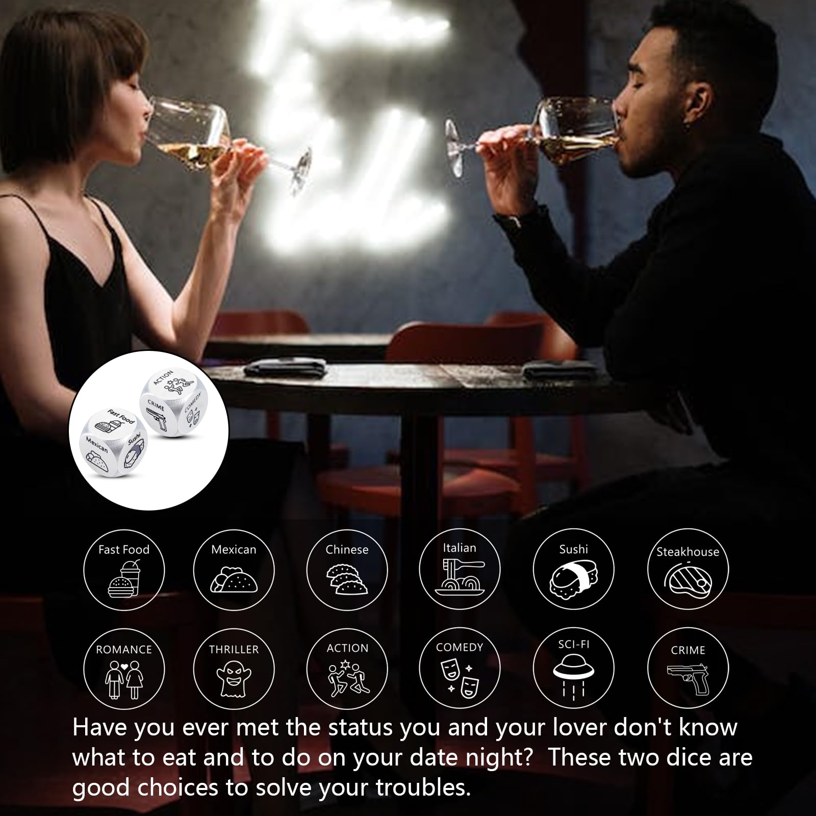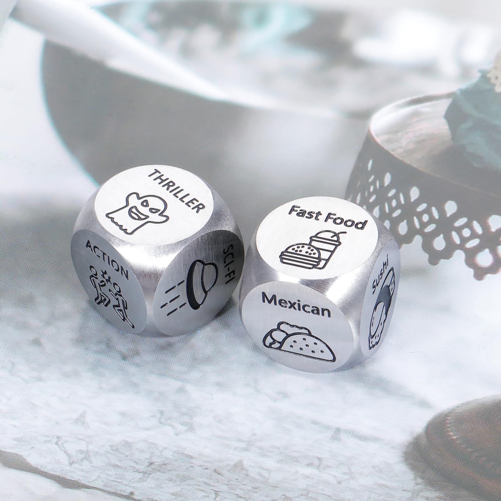 - Q: How can these dice be used for date night ideas? A: These funny dice can be rolled to decide on various date night activities, such as dinner options or movie selections. They serve as an engaging way for couples to interact and enhance their bonding experience.