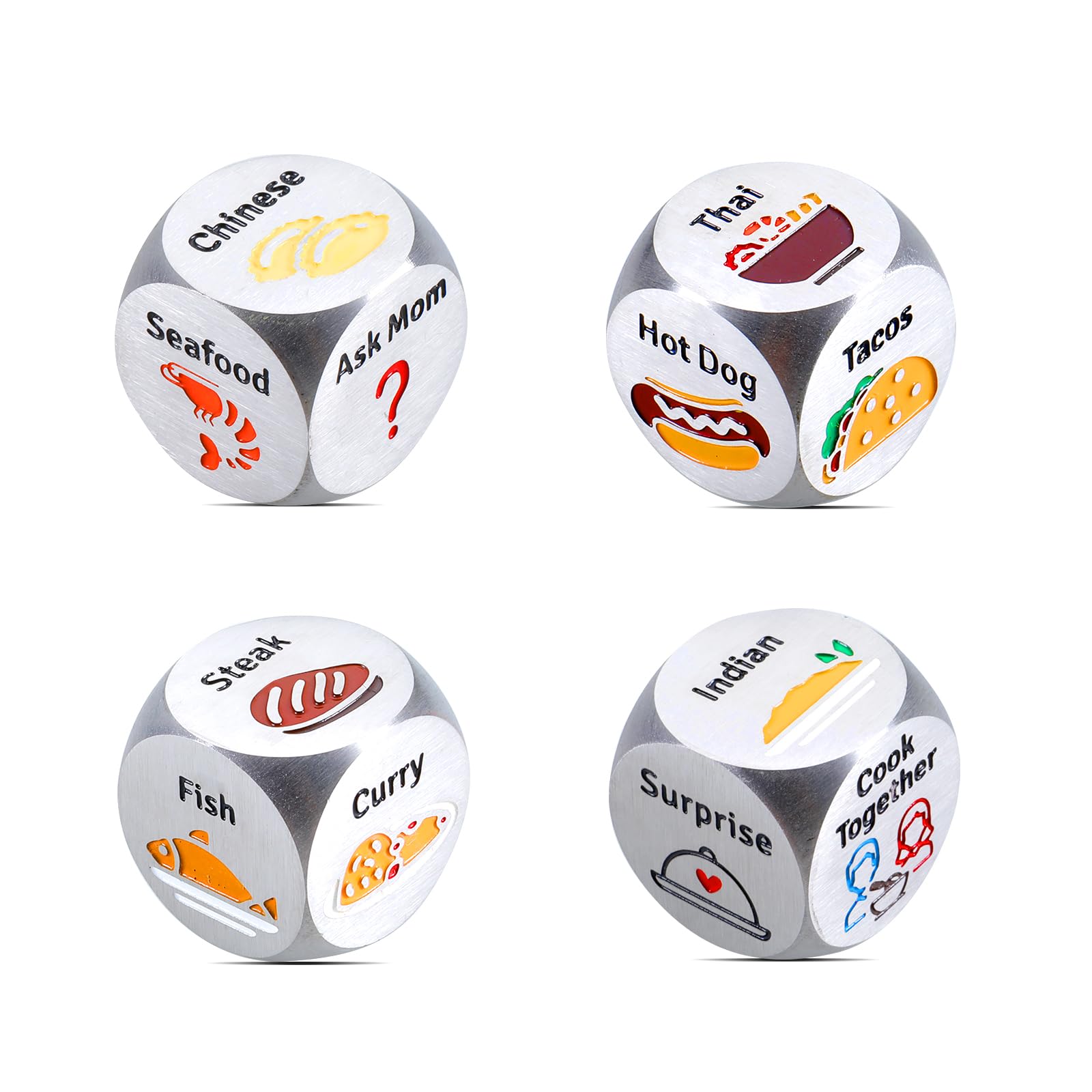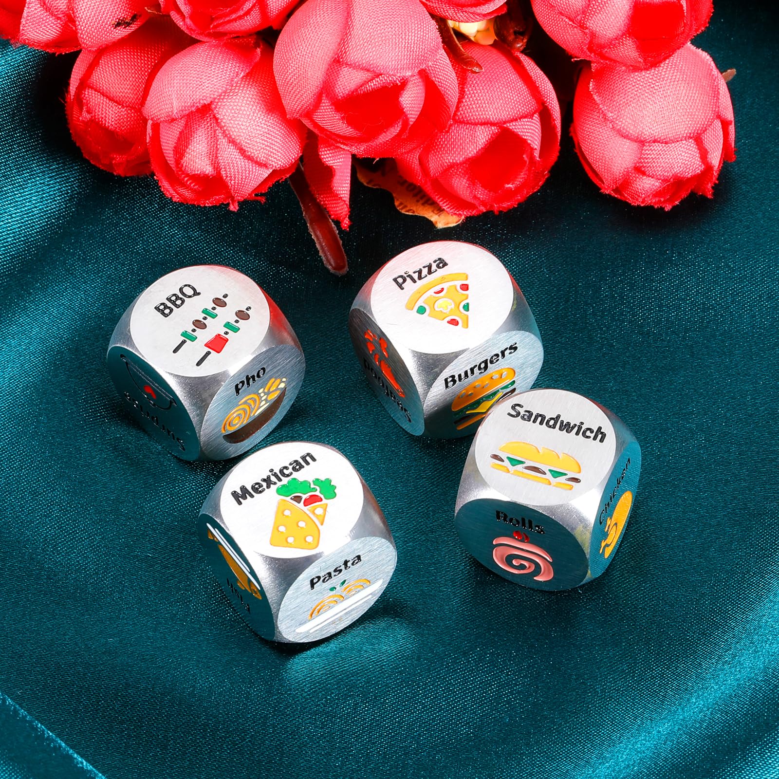 Roll these food dice to prevent the argument over what to eat for date night with her/him. Product Details: Number of Pcs: 4Length of Side: 16mm Material: stainless steel Each one is clearly written and colorful It is the time you have wasted for your rose that makes your rose so important. Accoliamber studio focuses on engraved crafts and specializes in designing and creating novelty dice, keychains, bookmarks, coins, and so on. Your satisfaction is our top priority. Accoliamber is a brand that attaches importance to the customer's feelings. Please feel free to contact us if you have any additional questions before or after your purchase, wed love to make it right!