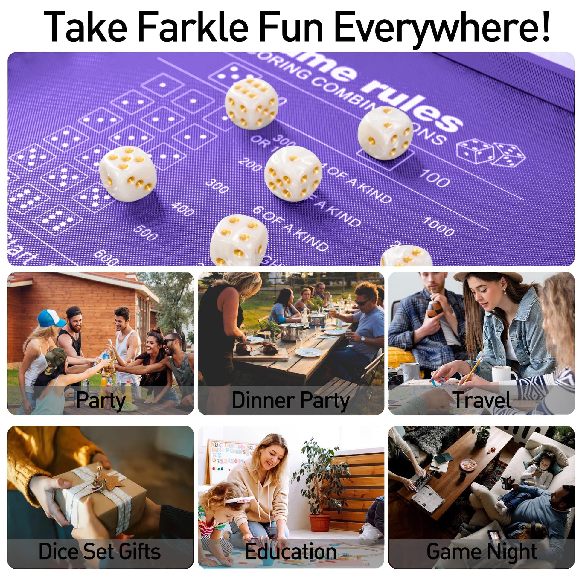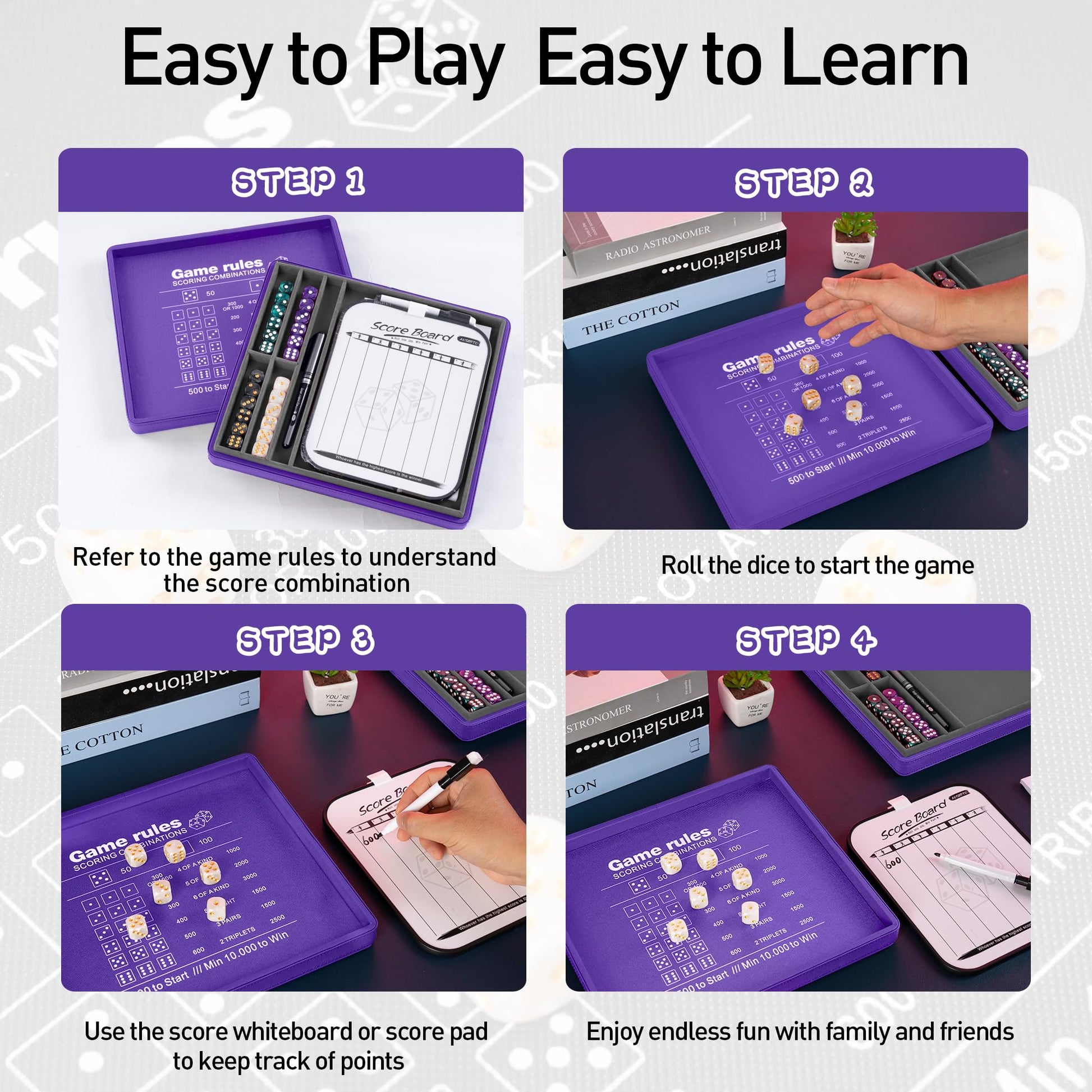 All-in-One Dice Game Kit for Endless Fun Elevate your game nights with this premium Classic Dice Game Set, designed for portability and durability. The set includes 24 pearl dice (4 sets of 6) , a dice tray with engraved rules on the lid for instant gameplay , and eco-friendly reusable scorekeeping tools (1 erasable board, 48 score sheets, pens, game rules). If you particularly like camping, this dice set can solve the problem of being difficult to roll dice on a picnic table or on the floor! Whether it's a birthday, Christmas, Father's Day, Mother's Day or Thanksgiving, etc., the deluxe dice set is an ideal gift choice for those who love to play dice, board game enthusiasts, outdoor games and family gatherings.
