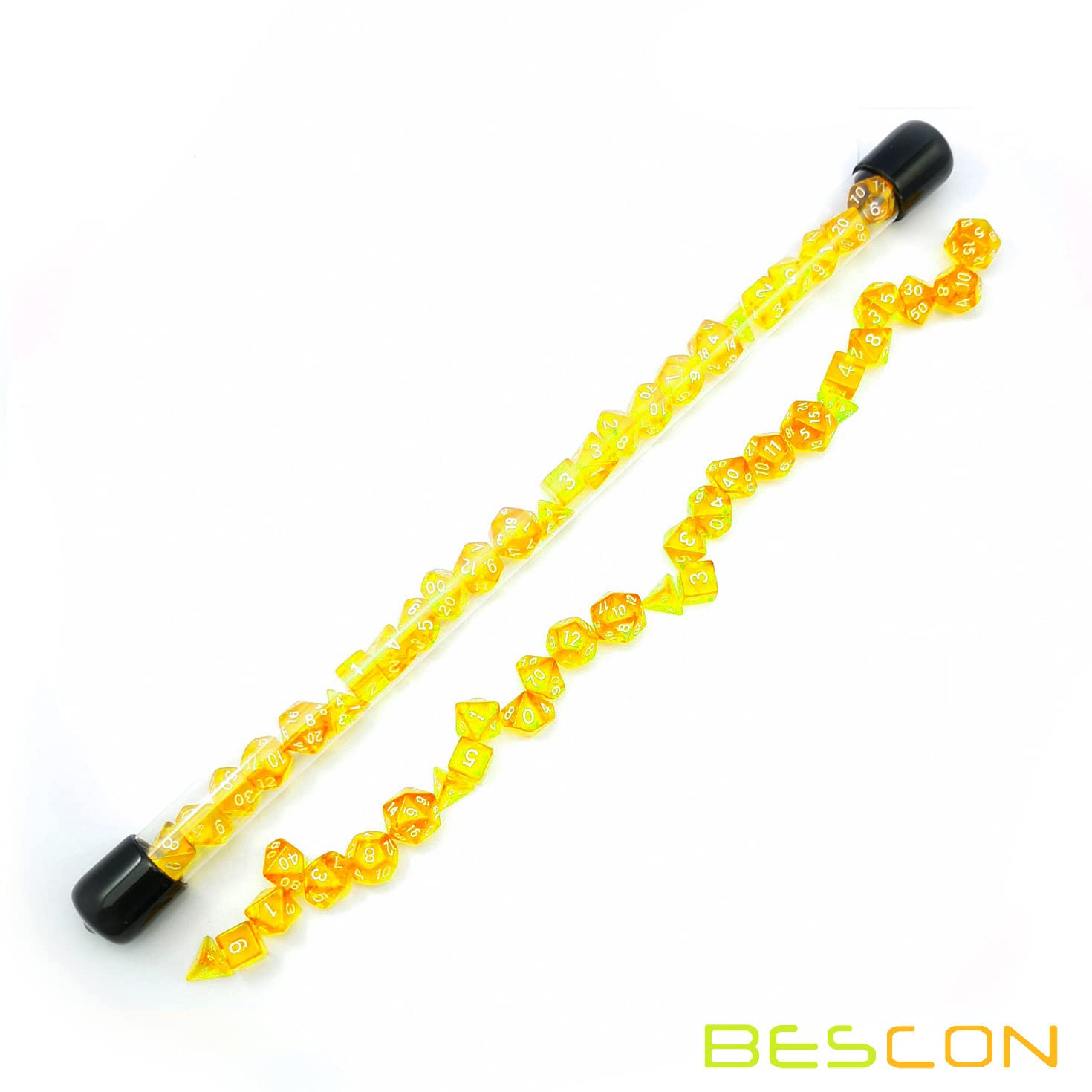Bescon 28pcs Translucent Yellow Mini Polyhedral Dice Set in Tube, Dungeons and Dragons RPG Dice 4X7pcs,Mini Gem Dice Set 28pcs mini gem Yellow Dungeons and Dragons dice (4 complete sets: D4, D6, D8, D10, D10 percentile, D12, D20). The clear tube is long enough to hold 28 dice: 11 5/8 inch (29.5CM), it keeps your gem stones safe. Why Mini Dice: They are more adorable and travel friendly, and they are more ''GEM''. Choking Hazard - Not for Children Under 5 * Top quality acrylic material * Each Set Includes d4, d6, d8, d10, d12, d20, and percentile die * Choking Hazard - Not for Children Under 3 * Long clear tube included Get your game on with these amazing polyhedral dice and prepare for action and adventure! Each RPG dice set includes 7 game dice. Whether youre exploring dungeons or fighting dragons these dice will get the job done in style.