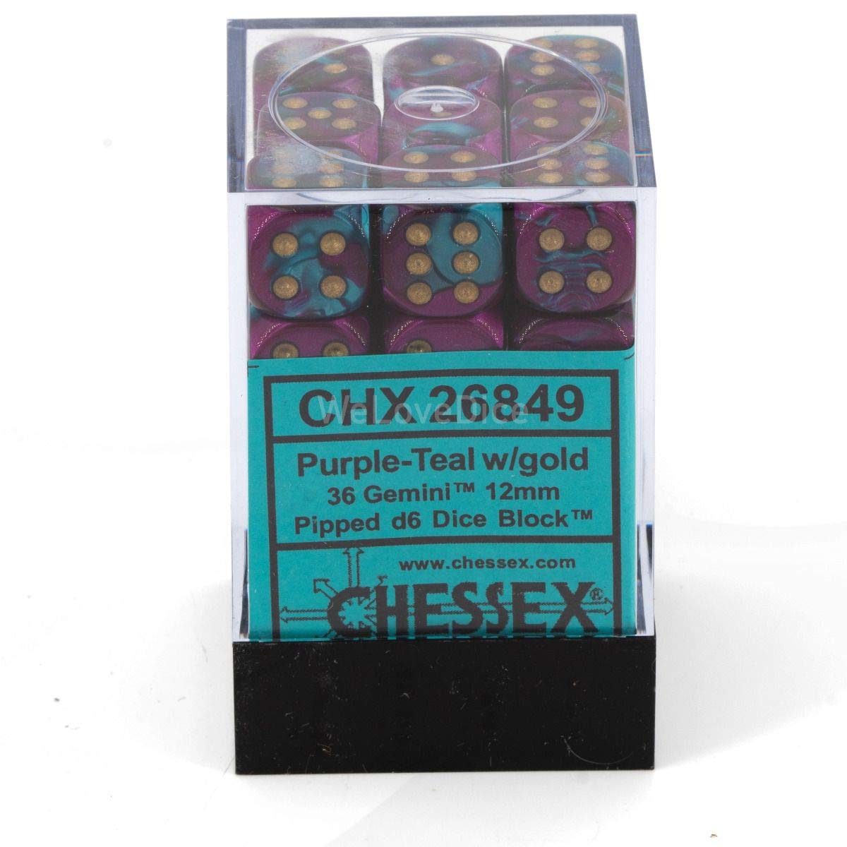 Chessex Dice D6 Sets: Gemini Purple & Teal with Gold - 12Mm Six Sided Die (36) Block of Dice