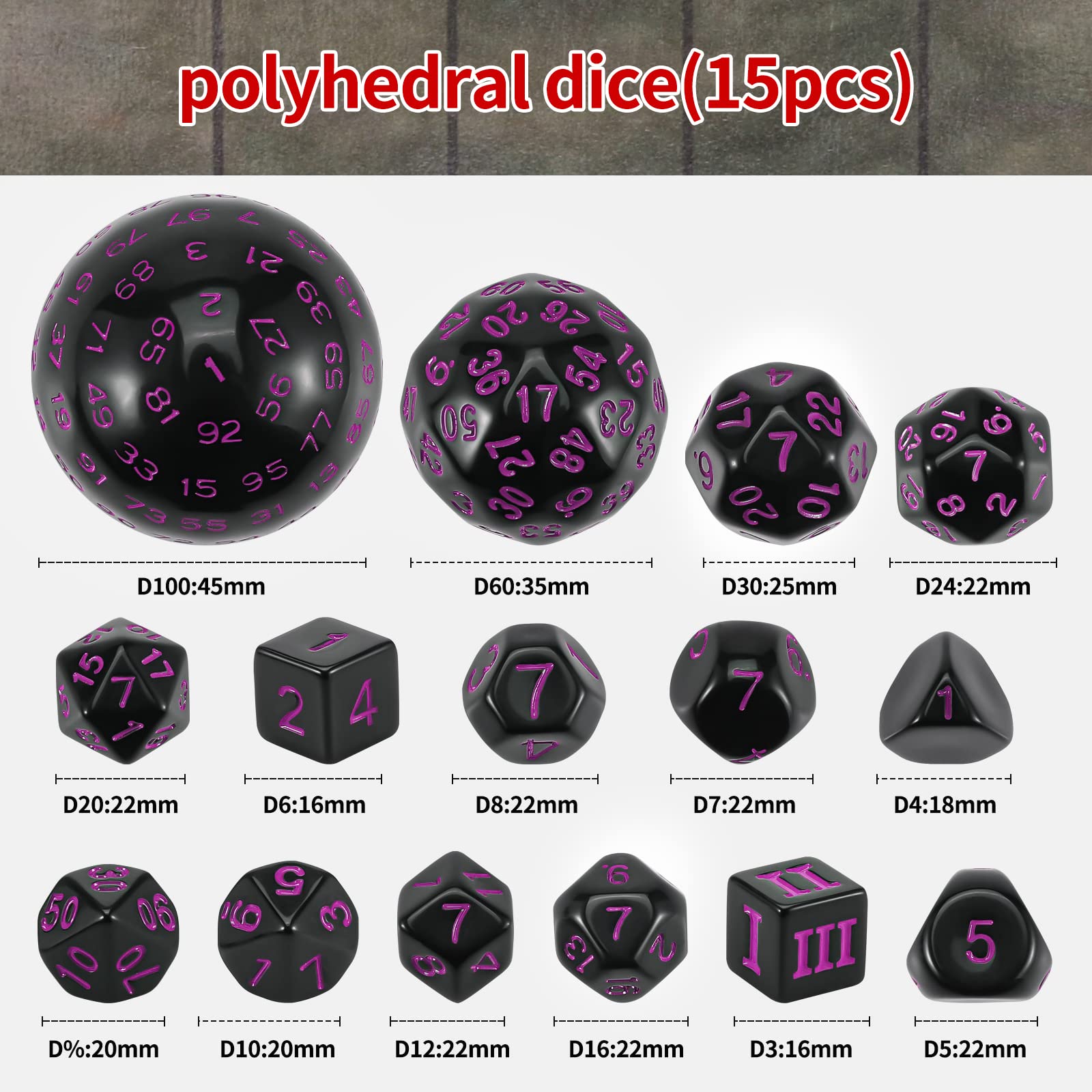 Specification: Item Type: Polyhedral Dice Set Material: Quality Acrylic, Package List: 15 x Dices (1*D4, 1*D5, 1*D6, 1*D7, 1*D%, 1*D8, 1*D10, 1*D12, 1*D16, 1*D20, 1*D24, 1*D30, 1*D60 and 1*D100) 1 x velvet dice pouch These polyhedral game dices are made from Quality acrylic material, waterproof and wear-resistant, durable and lightweight, smooth surface and comfortable to hold, and come with a velvet dice pouch for easy to store and carry. Wide application: These DND Dices Perfect for Table Games, Board Game, D&D, MTG, Shadowrun, Pathfinder, Heroscape, Savage World, Yahtzee, Math Games, etc.