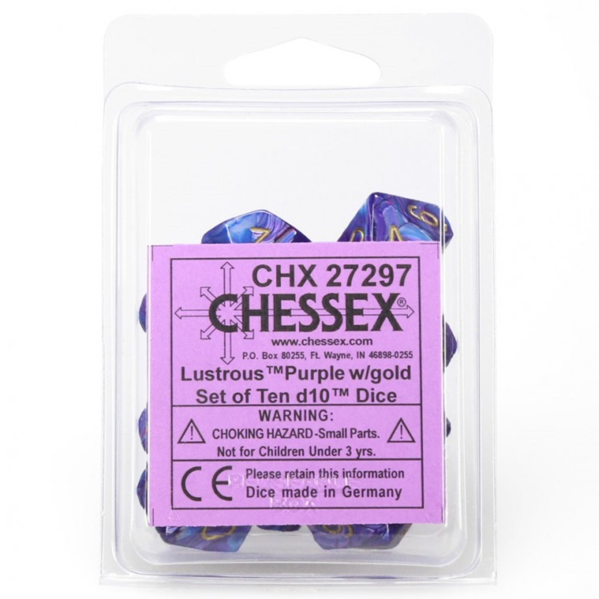 - Q: What is included in the Chessex 27297 Dice set? A: The Chessex 27297 Dice set includes ten D10 dice that feature a lustrous purple color with gold markings, perfect for various tabletop games.