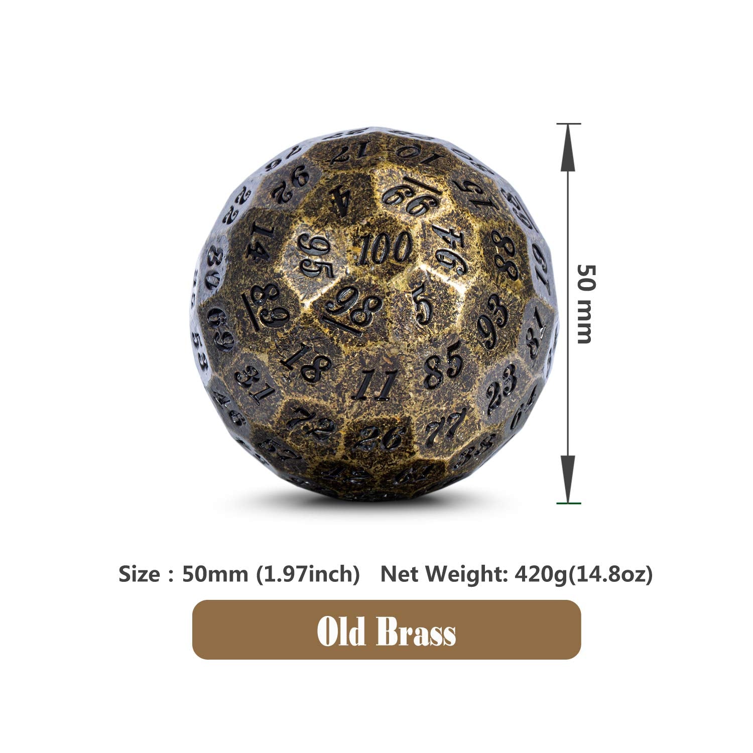 Product Description DNDND Metal Dice D100 includes 1 Piece D100 dice with metal case and velvet pouch. Specification Material: Zinc alloy Color:Old brass with Black Number Net Weight: 420g (14.8Oz) Diameter:50mm (1.97inch) Package Include: 1* D100 Old Brass Metal Dice 1* Metal Case 1* Velvet Pouch Dice Warranty If you receive defective dies or missing dies set,please contact us for replacement. Warm Notice Heavy part, please keep them away from children.