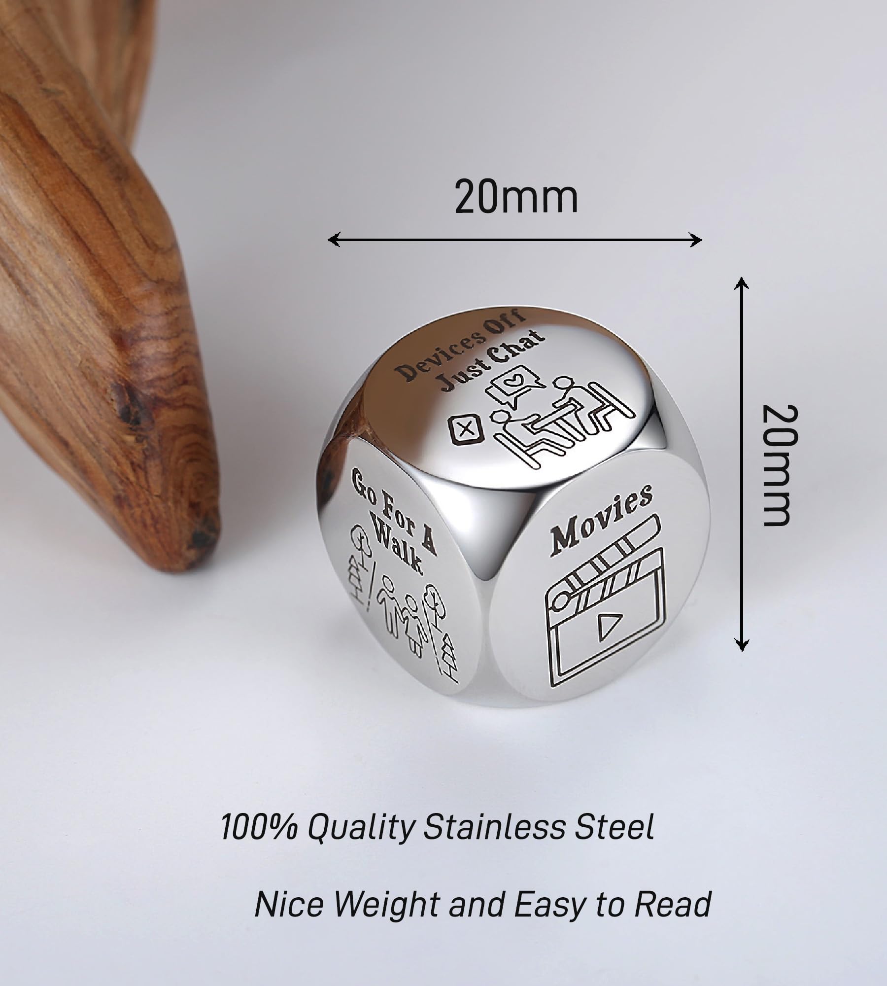 - Q: What material is the date night dice made from? A: The date night dice is crafted from hypo-allergenic surgical grade 316L stainless steel, ensuring durability and resistance to fading or tarnishing over time.