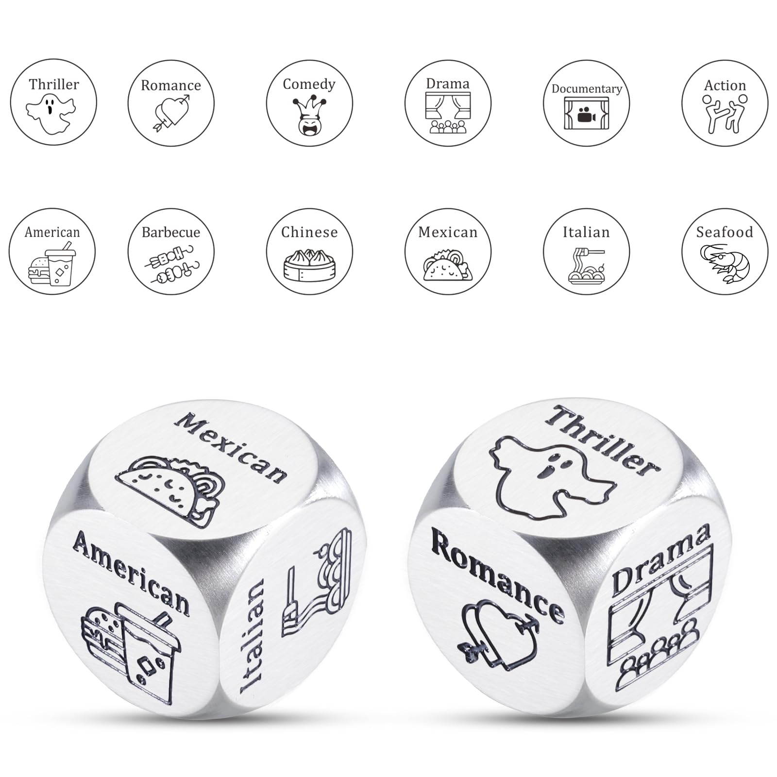 - Q: How do the date night dice work for deciding activities? A: The Funny Date Night Dice feature two sides, one for choosing the type of activity (like Thriller, Romance, Comedy, etc.) and the other for selecting dinner options (such as Barbecue, Chinese, Italian, etc.). Simply roll the dice to determine your date night plans!