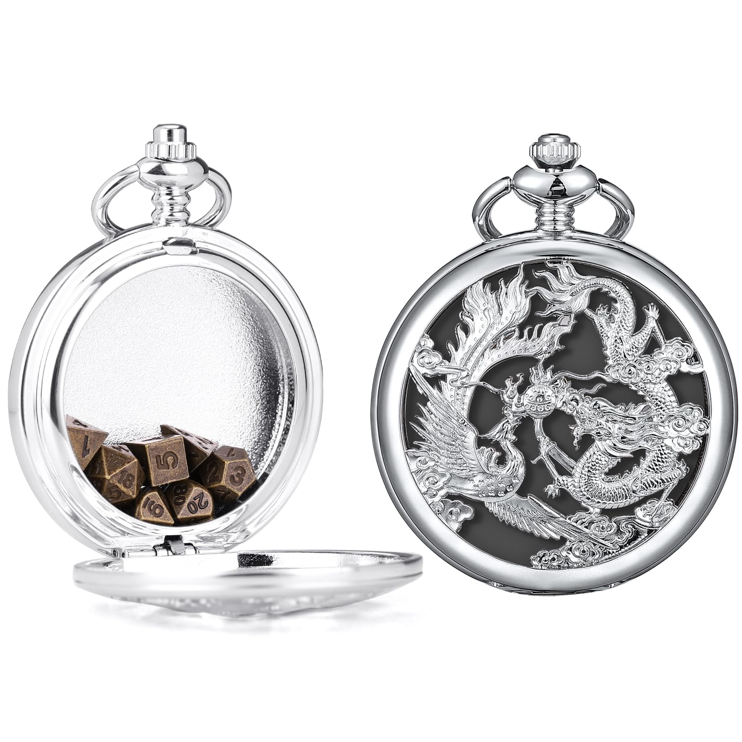 - Q: What is included in the ManChDa Mini D&D Dice Set? A: The ManChDa Mini D&D Dice Set includes a complete set of 7 micro polyhedral dice made of solid zinc alloy, a stylish Dragon & Phoenix pocket case for easy portability, a stainless steel necklace, and a stainless steel chain.