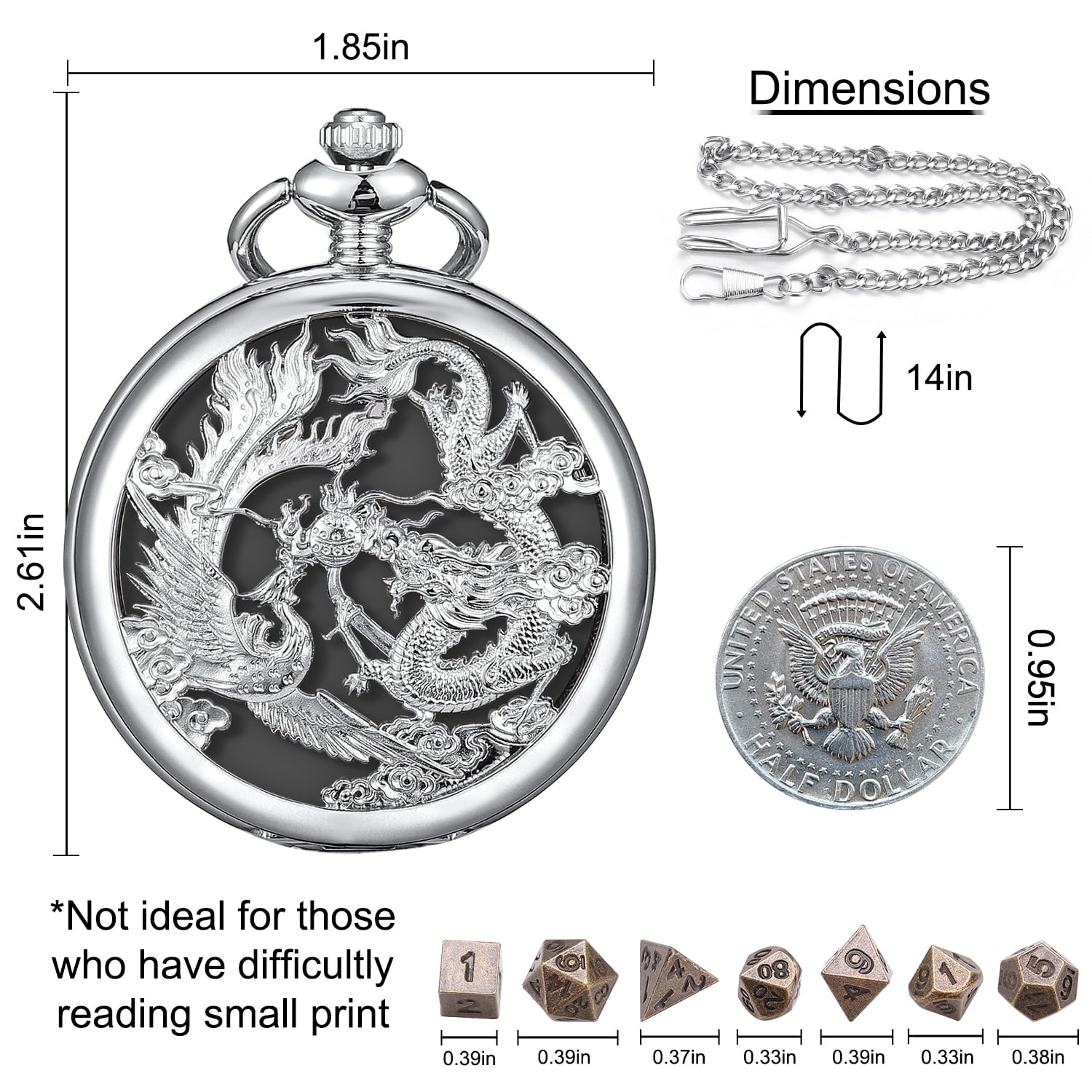 DescriptionFeatures:1.Reloj de bolsillo de la serie Classic es el mejor regalo para su amor, la antigedad o usted mismo.2.Diseo elegante negro cazador con Drag n y Phoenix patr n, movimiento mec nico esqueleto.3. Retro del dial especial y de bolsillo n mero romano reloj con forma de poca.Especificaci n (aproximado)- Diameter of the caja:49.5 mm.- Grosor of the caja:15 mm.- Material of the Caja: Aleaci n.- Longitud of the padlock: 370 mm (gancho incluido).- Lock material: Aleaci n.C mo utilizar / set reloj de bolsillo mec nico?Una vez que reciba el reloj mec nico:A. Tiempo adjustmentTire de la corona hacia afuera de la base del reloj y gire la corona hacia la derecha hasta llegar a la hora exacta.B. Dar cuerda al relojPresione la corona en su lugar a lo largo de la base del reloj y la liquidaci n de la rotaci n de la rotaci n de la rotaci n delas agujas del reloj reloj con 20-25 vueltas. La potencia estar lleno(M s de bobinado en ltima instancia,romper the primavera). Haga esto una vez al d a (Antes de dormir). De otra manera, dejar de funcionar.Por favor, no sobre la liquidaci n del reloj si se siente la corona es apretado.Package includes:-1 x Reloj de bolsillo-1 x Caja de regalo-1 x padlock.