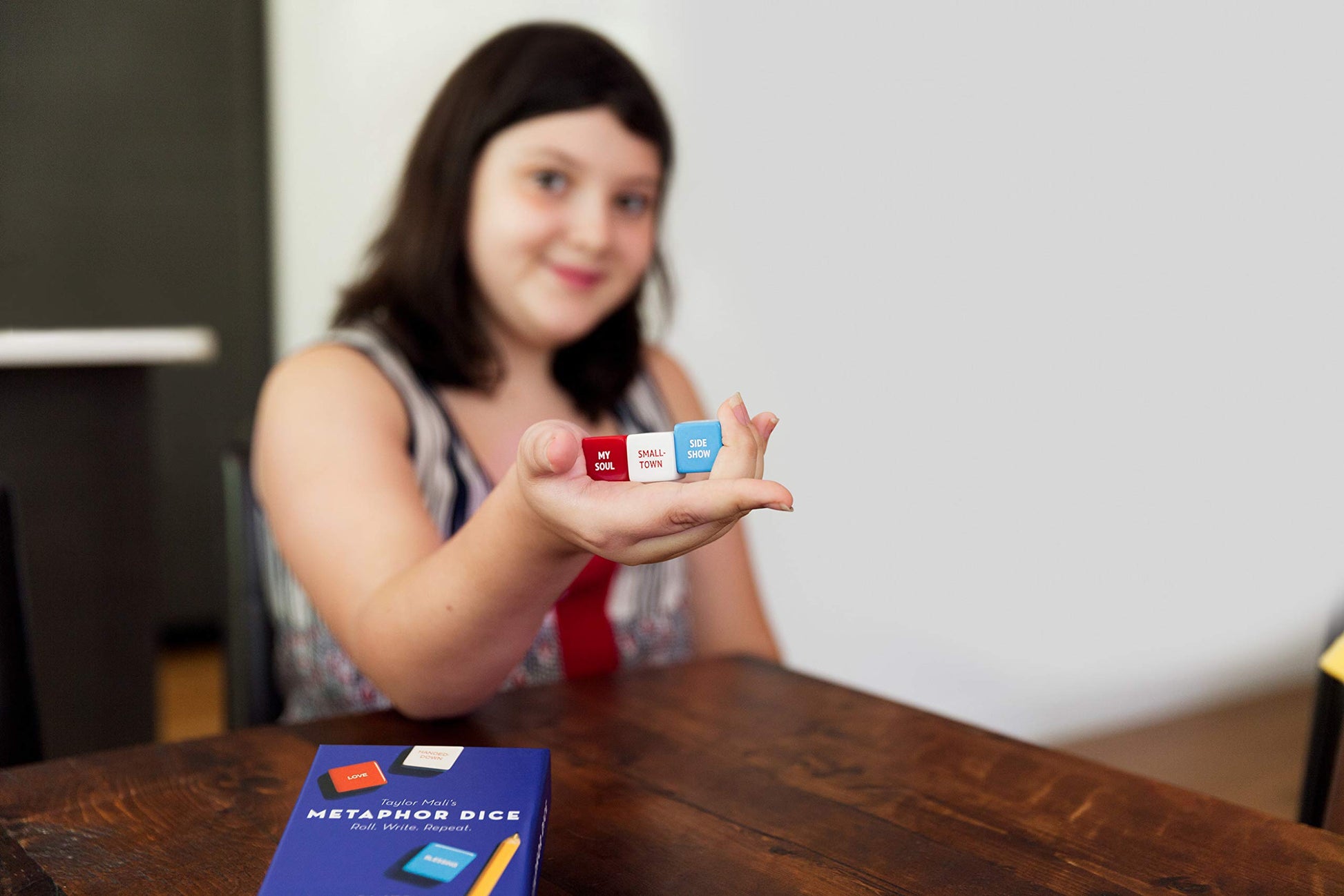 An ingenious writing tool and poetry prompt generator that helps writers of all levels think and write for figuratively based on the understanding that a metaphor is simply an equation between an idea and an object (with perhaps an adjective thrown in as a variable). The brainchild of poet & educator Taylor Mali (''What Teachers Make''), Metaphor Dice allow the user to ''write backwards'' by presenting thousands of metaphors to see if any seem worth a few minutes of exploration.