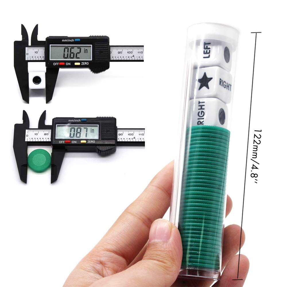 - Q: What is the size of the Spidfee Right Left Center Dice Game Set? A: The game set measures approximately one inch in length, one inch in width, and five inches in height. This compact size makes it easy to store and transport.