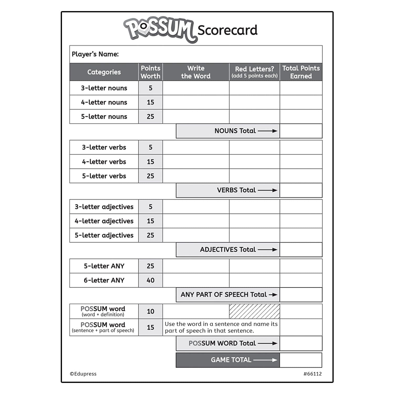 POSSUM is a dice game in which players use six dice to spell out words and earn points by filling categories on their scorecards. The categories are arranged by parts of speech. Players have to make nouns, verbs, and adjectives. They also try to make 5- and 6-letter words of any part of speech. Players get extra points for using less common letters in their words. In addition, players can have fun by making up one word-a POSSUM word-as long as they can use it in a sentence and name its part of speech in that sentence. Points are recorded on a scorecard, and the player with the most points at the end of the game is the winner. Includes an instruction sheet, 6 letter dice, and 100 scorecards. For 2-6 players.