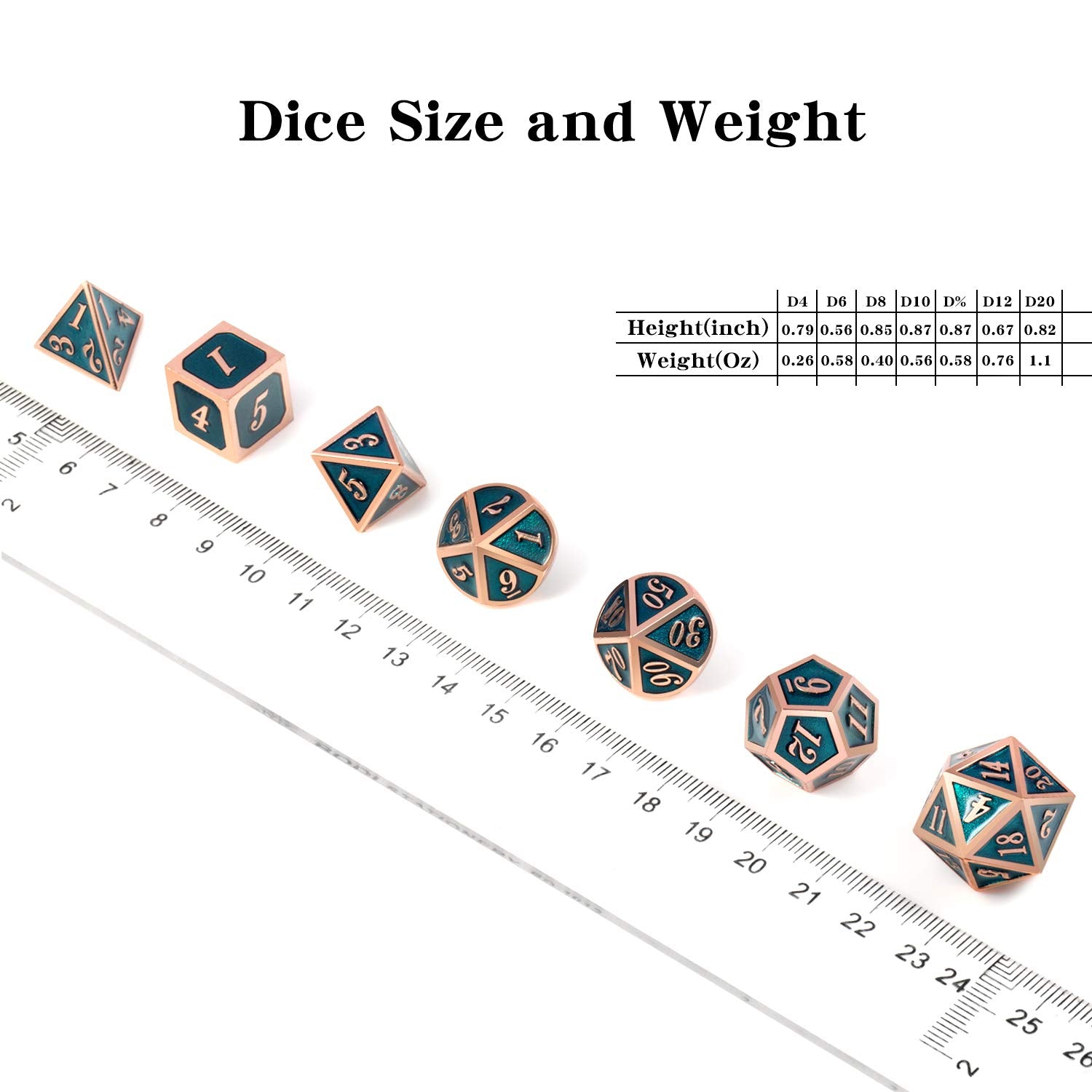 b>Product Description Metal Polyhedral Dice Set of 7 Pieces with metal case. Includes D4, D6, D8, D10, D12, D20 and D%. The dice are perfect for RPGs such as Dungeons and Dragons, Shadowrun, Pathfinder, Savage World, Warhammer, Yahtzee, and many other RPG. Specification Material: Zinc Alloy Color:Teal with Copper Number Net Weight: 3.76Oz D4 : 0.19Oz D6 : 0.54Oz D8 : 0.35Oz D10: 0.51Oz D %: 0.52Oz D12: 0.71Oz D20: 0.94Oz Package Include: 1* Teal & Copper D&D Metal Dice Set 1* Metal Box Dice Warranty If you receive defective dies or missing dies set, please contact us for replacement. Warm Notice Small parts, please keep them away from children.