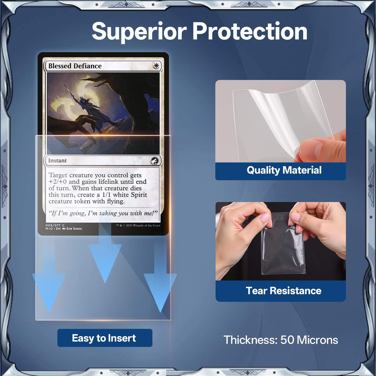 VALUE PACK-Each pack contains 6 packs of perfect fit sleeves and 6 packs of matte card sleeves each pack includes 100 card sleeves for a total of 1200 card sleeves. Use for games that are frequently shuffled and played to maximize card life. | WIDE COMPATIBILITY-The matte sleeves are perfectly sized to fit standard cards such as MTG cards Yugioh cards gaming cards baseball cards football cards Kpop cards etc. They are ideal for card collectors. | enhanced MATERIALS-The card sleeves for mtg are made from safe and harmless materials to ensure maximum protection for your gaming cards. This not only prevents dust and water but also prevents the card from fading reduces wear and tear and ensures your cards remain in excellent condition for years. | HIGH CLARITY-The exact fit card sleeves and magic card sleeves are made of well-made clear and durable material. They maximize the life of the card and showcase the vivid details of the cards. They are waterproof dustproof and scratchproof making them the perfect choice for card collectors. | DOUBLE SLEEVING-The inner sleeves are precision-cut to double sleeving which are able to fit matte card sleeves mtg card sleeves and card protector sleeves. They can provide extra protection to your valuable cards.